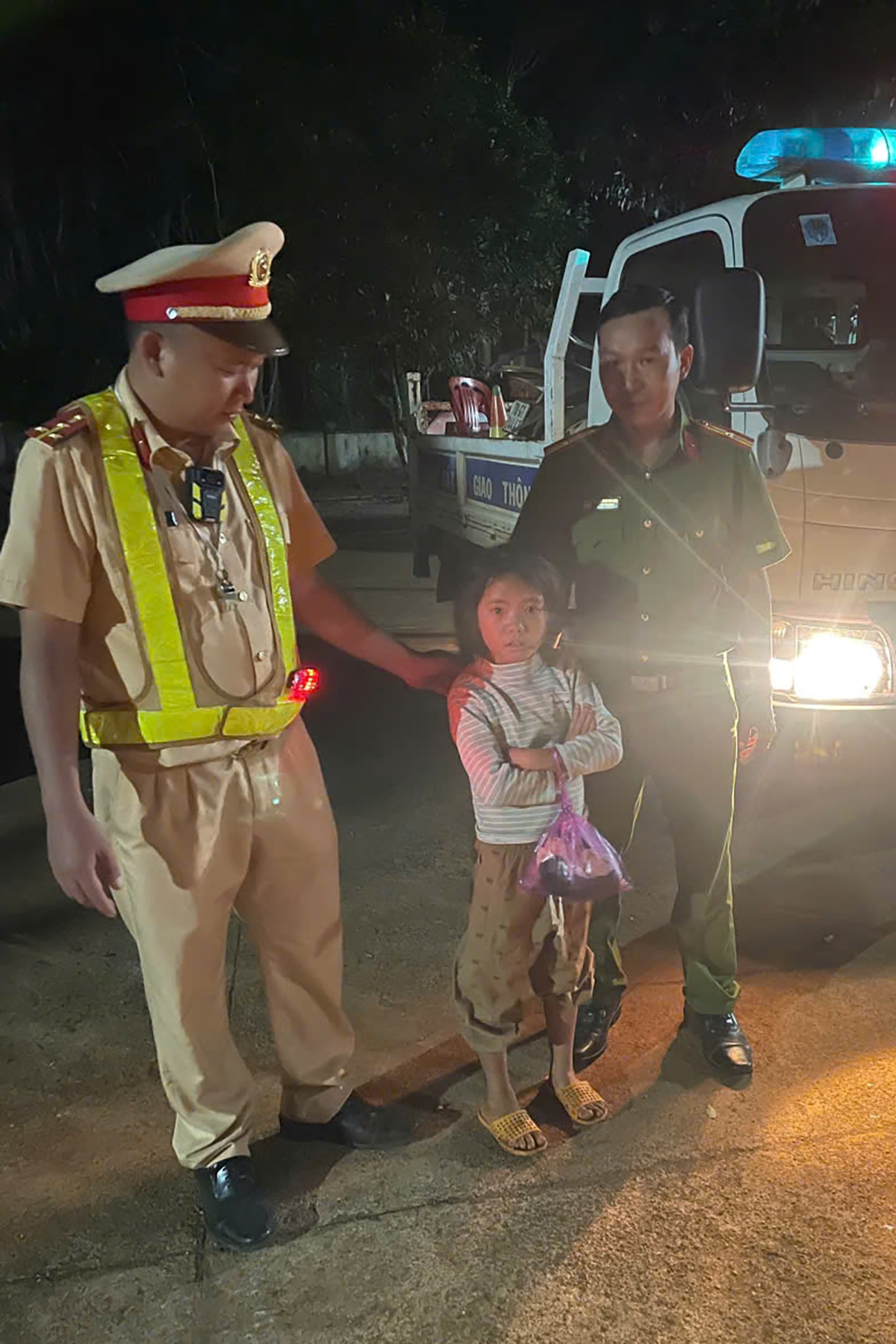 Lực lượng CSGT và công an địa phương đã dùng xe đặc chủng để đưa cháu bé về với bố mẹ. Quãng đường từ vị trí phát hiện cháu bé đi lạc tới nhà hơn 40 km.