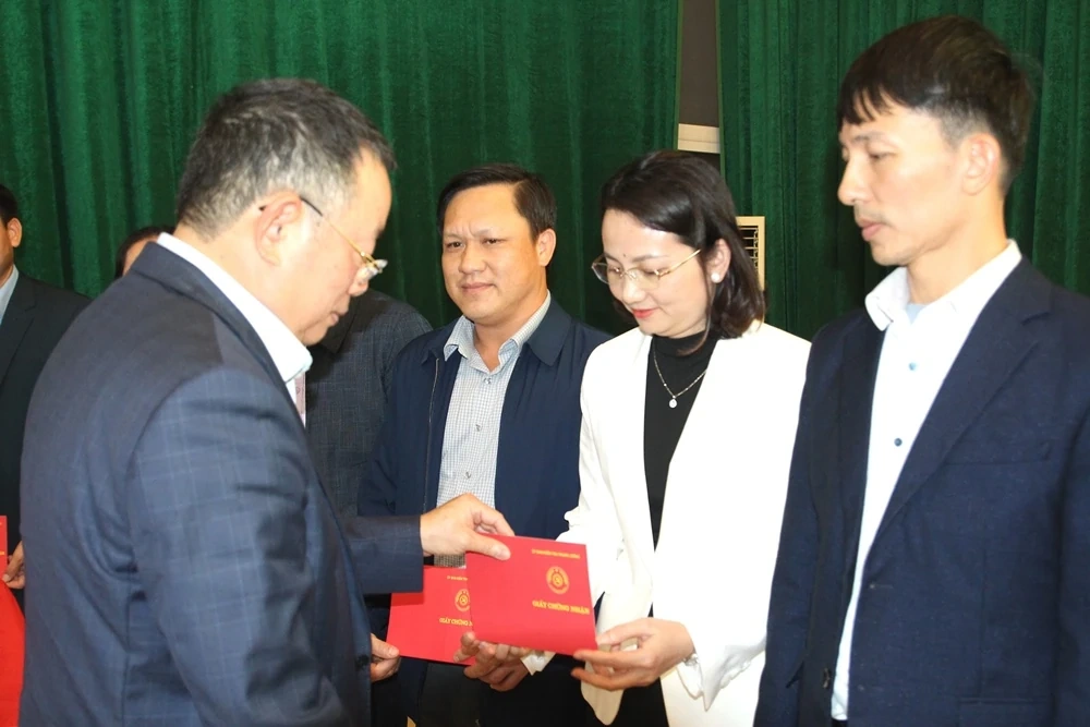 Các đồng chí: Hoàng Văn Trà, Phó Chủ nhiệm UBKT Trung ương; Nguyễn Hồng Phong, Phó Bí thư Thường trực Tỉnh ủy Thanh Hóa trao Giấy chứng nhận hoàn thành lớp bồi dưỡng cho các học viên.