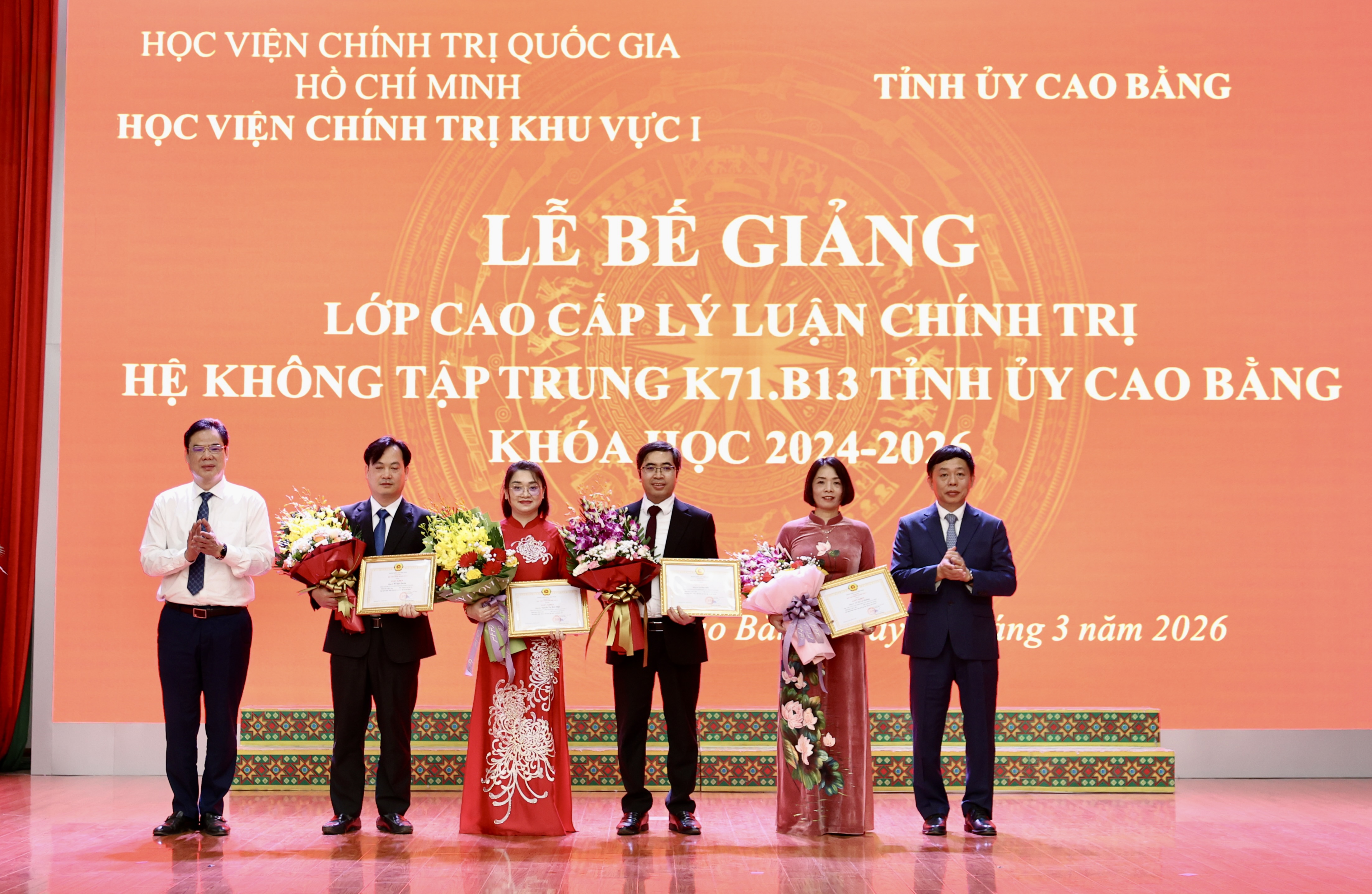 Phó Bí thư Tỉnh ủy, Chủ tịch Ủy ban MTTQ Việt Nam tỉnh Vũ Hồng Quang và PGS.TS Nguyễn Vĩnh Thanh, Giám đốc Học viện chính trị khu vực 1 trao giấy khen cho các học viên có thành tích xuất sắc trong học tập và rèn luyện.