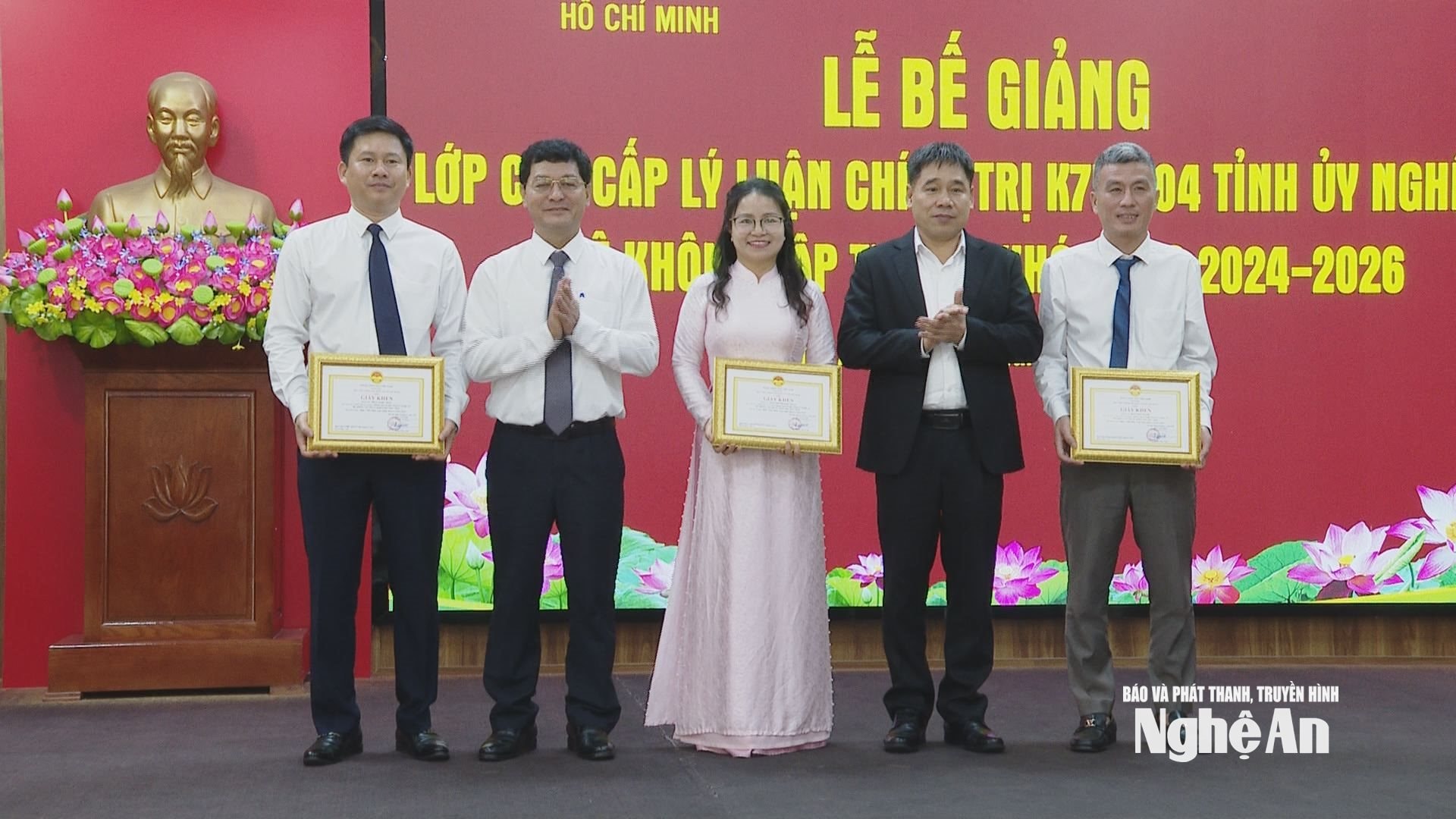 Đồng chí Phạm Trọng Hoàng - Ủy viên Ban Thường vụ, Trưởng ban Tổ chức Tỉnh ủy và TS Đậu Tuấn Nam - Vụ trưởng Vụ Quản lý đào tạo, bồi dưỡng Học viện Chính trị quốc gia Hồ Chí Minh trao Giấy khen cho 3 học viên có thành tích xuất sắc trong học tập, rèn luyện. Ảnh: PV