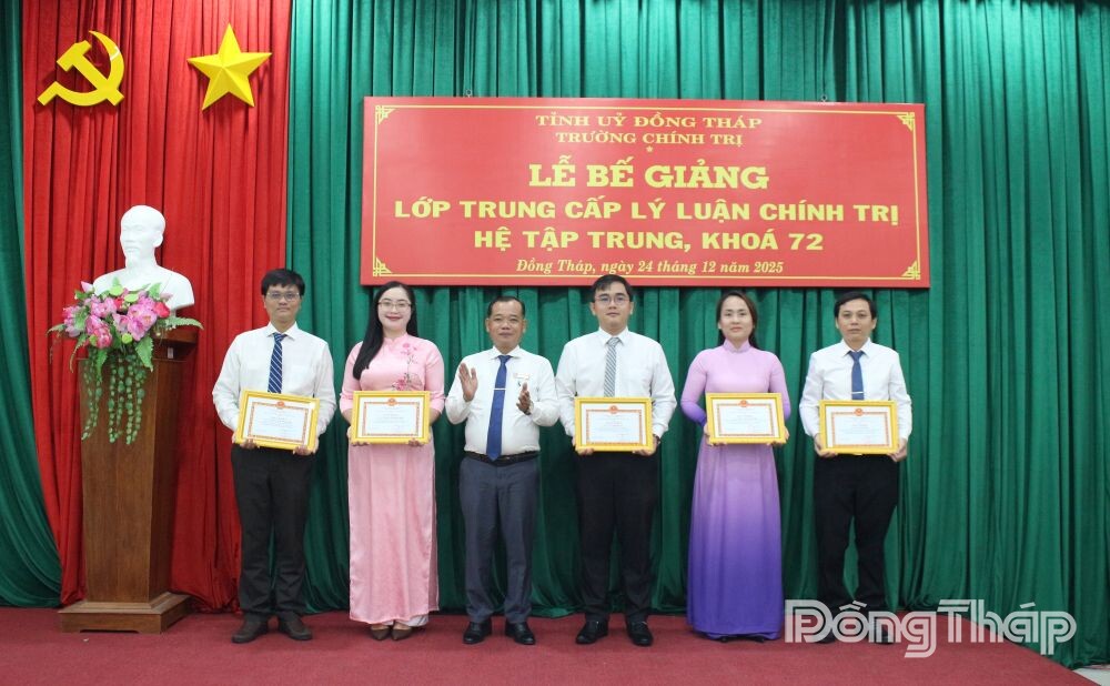 Phó Hiệu trưởng Trường Chính trị tỉnh Đồng Tháp Nguyễn Văn Sơn trao Giấy khen cho 5 học viên đạt thành tích tiêu biểu trong học tập và rèn luyện.