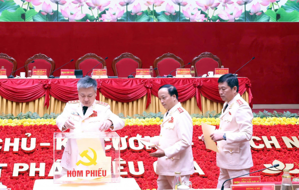 Các đồng chí trong Đảng ủy Công an Trung ương, lãnh đạo Bộ Công an bỏ phiếu tại đại hội.