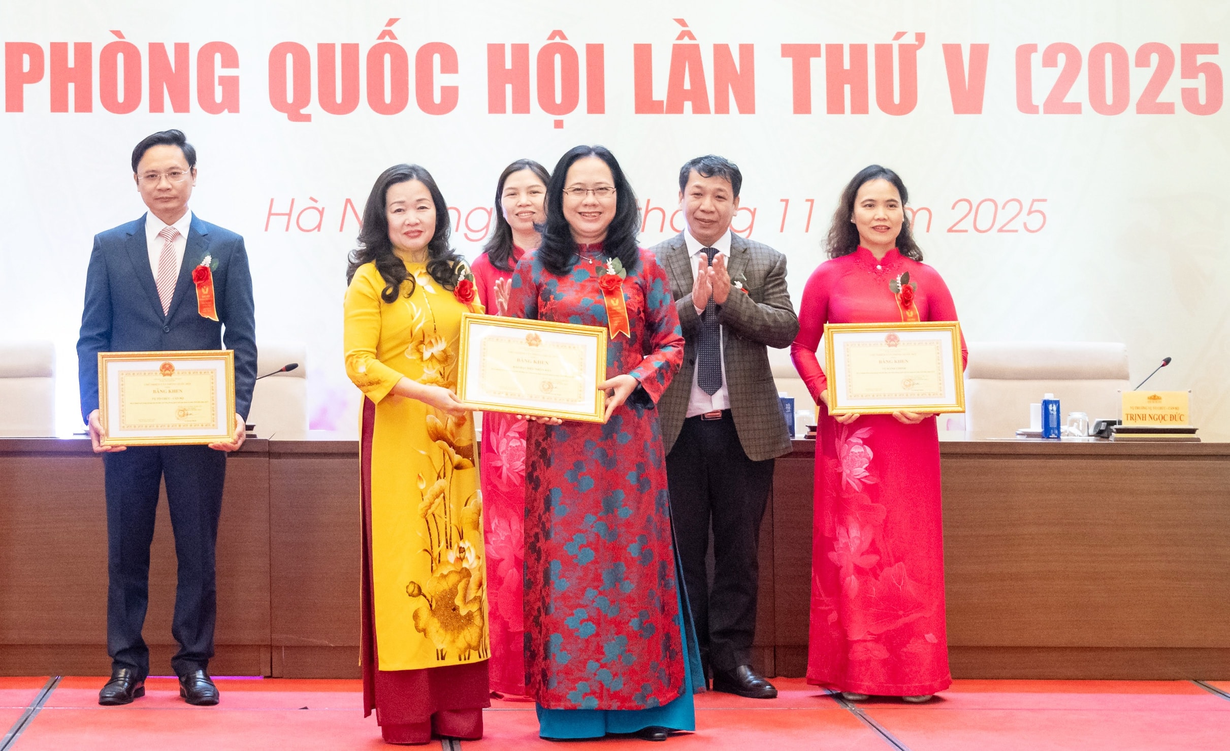 Phó Chủ nhiệm Văn phòng Quốc hội Nguyễn Thị Thúy Ngần trao tặng Bằng khen của Chủ nhiệm Văn phòng Quốc hội cho 5 tập thể có thành tích xuất sắc trong Phong trào Thi đua yêu nước giai đoạn 2020 - 2025. Ảnh: Phạm Thắng