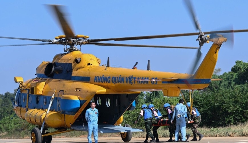 Diễn tập vận chuyển y tế đường không đối với bệnh nhân bị thương nặng. Ảnh: Việt Trung