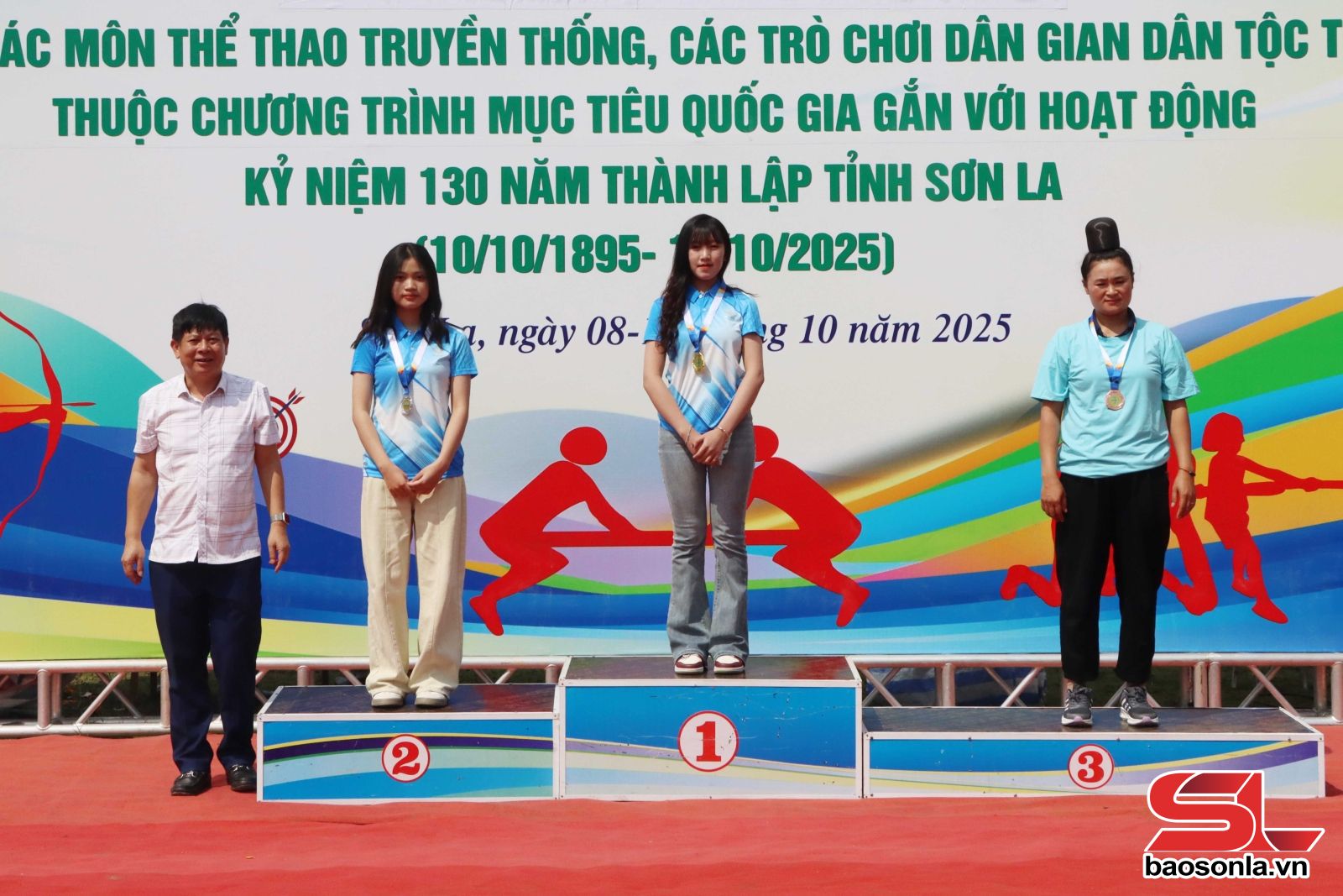 Ban tổ chức trao huy chương cho các vận động viên nữ môn bắn nỏ nội dung quỳ.
