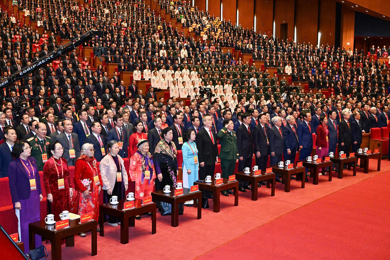 Các đại biểu thực hiện nghi lễ Chào cờ tại phiên Khai mạc Đại hội đại biểu toàn quốc lần thứ XIV của Đảng. Ảnh: C.T.V