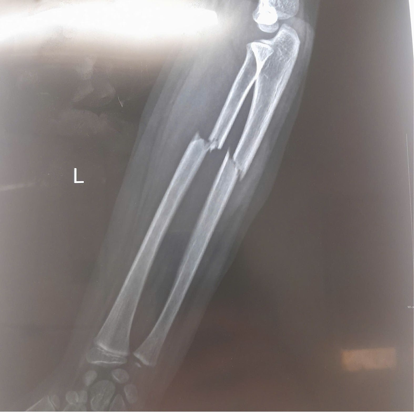 Gãy kín 1/3 trên hai xương cẳng tay trái gây đau, hạn chế vận động.