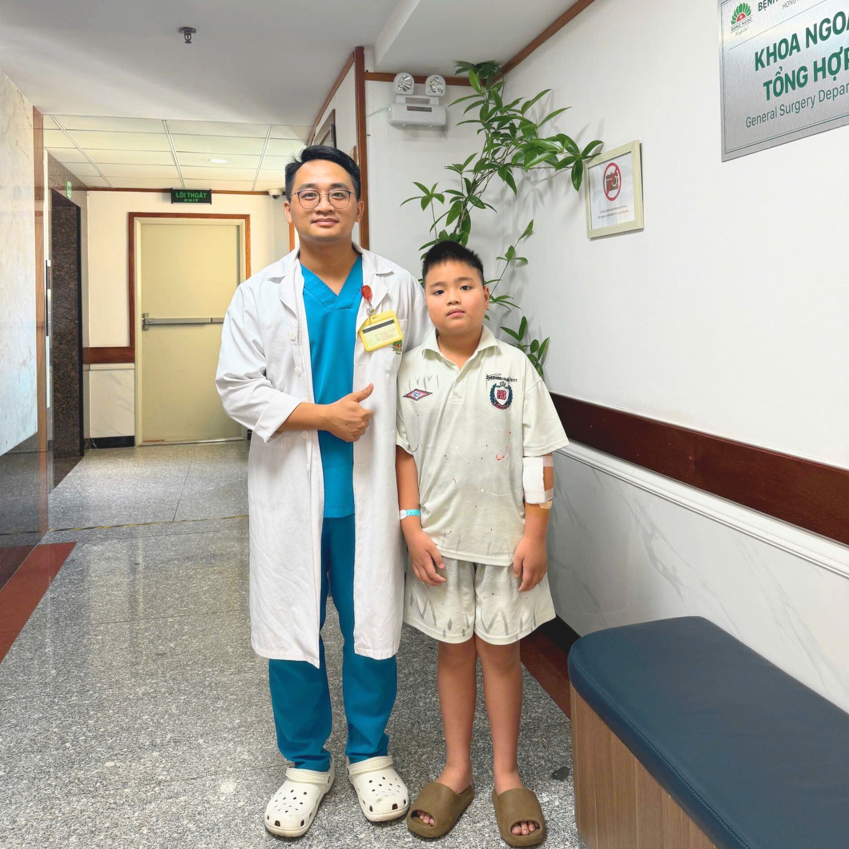 Bác sĩ Nguyễn Văn Tú (Khoa Ngoại tổng hợp BVĐK Hồng Ngọc) động viên bệnh nhi trong quá trình hồi phục sau mổ.