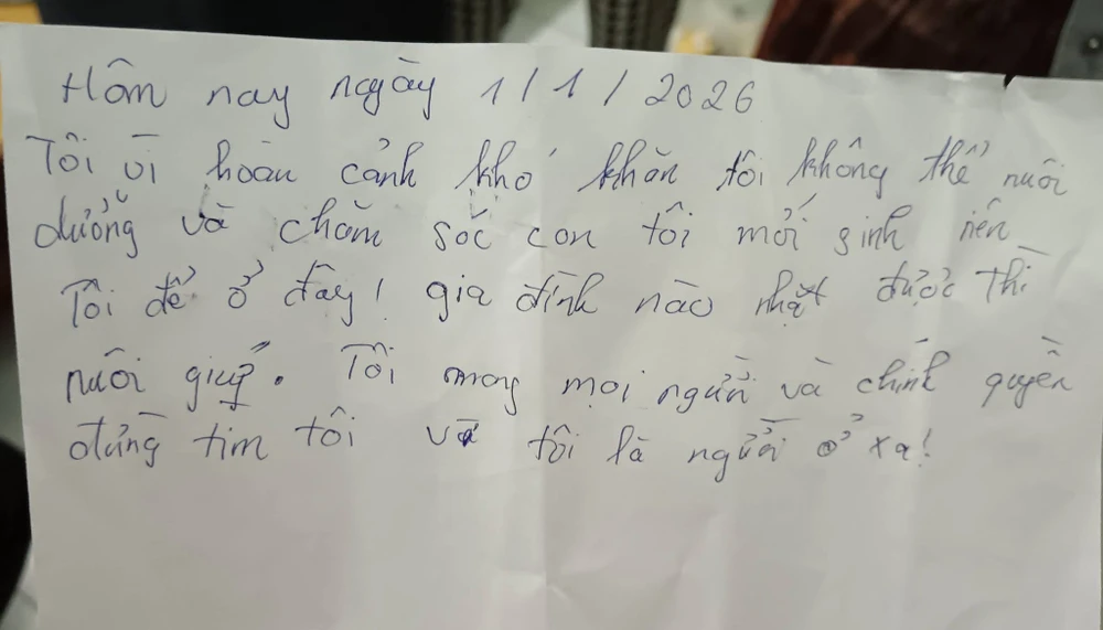 Người bỏ rơi để lại tờ giấy ghi nội dung 'vì hoàn cảnh khó khăn, nhờ người nhặt được nuôi giúp'.