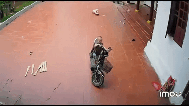 Sự việc diễn ra trong một khoảng sân khá rộng, nơi có một chiếc xe đạp điện được dựng sẵn. Trong clip, một bé trai với sự hiếu kì đã đã tiến lại gần và leo lên chiếc xe.