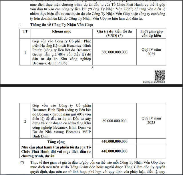 Thông tin về các công ty nhận vốn góp nhưsau: 360 tỷ đồng dùng để góp vốn vào Công ty Cổ phần Phát triển Hạ tầng Kỹ thuậtBecamex -Bình Phước (công ty liên kết do Becamex Group nắm giữ 40% vốn điều lệ)để đầu tư dự án Khu công nghiệp Becamex -Bình Phước và 80 tỷ đồng dùng để góp vốnvào Công ty Cổ phần Becamex Bình Định (công ty liên kết do Becamex Group nắm giữ40% vốn điều lệ) để đầu tư dự án Đầu tư xây dựng và kinh doanh cơ sở hạ tầngKhu công nghiệp Becamex Bình Định và Dự án Nhà xưởng Becamex VSIP Bình Định.