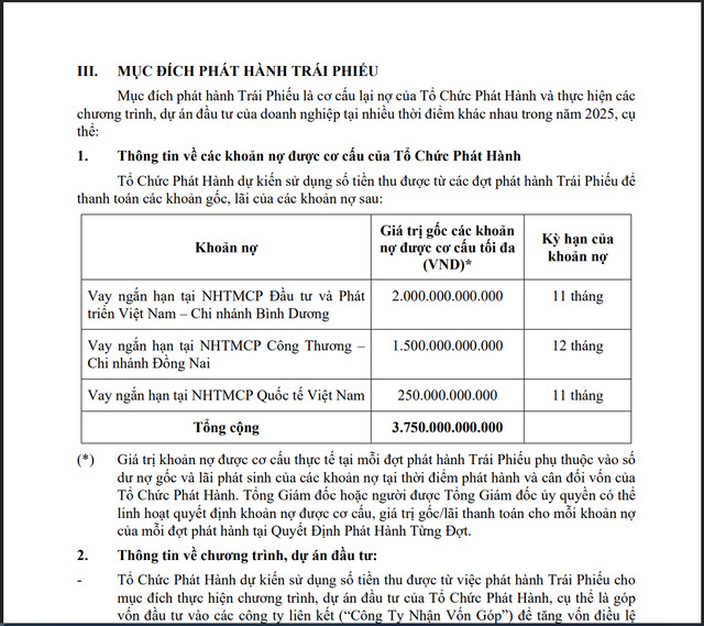 Mục đích phát hành trái phiếu là cơ cấu lại nợ của công tyvà thực hiện các chương trình, dự án đầu tư của doanh nghiệp tại nhiều thời điểmkhác trong năm 2025.