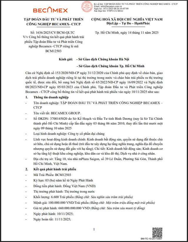 Theo thông tin được công bố, từ ngày 10/11-11/11/2025,Becamex Group đã hoàn tất phát hành 6.600 trái phiếu mã BCM12503 ra thị trườngtrong nước. Với mệnh giá 100 triệu đồng/trái phiếu, lô trái phiếu có tổng giátrị phát hành 660 tỷ đồng, kỳ hạn 3 năm, dự kiến đáo hạn vào ngày 10/11/2028.