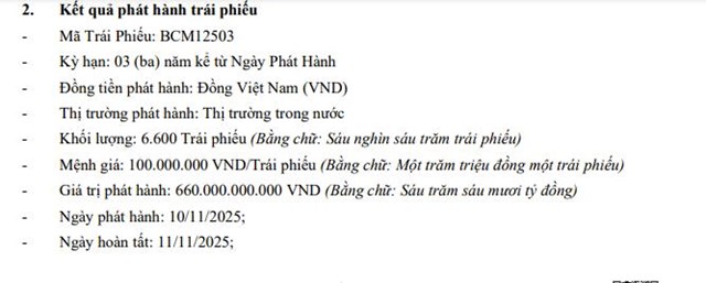 Theo đó, từ ngày 10/11 - 11/11/2025, Becamex Group đã hoàn tất phát hành 6.600 trái phiếu mã BCM12503 ra thị trường trong nước.