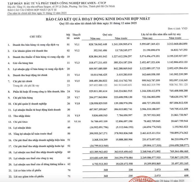 Về bức tranh tài chính, theo báo cáo kinh doanh hợp nhất quý III/2025, BCM ghi nhận doanh thu thuần đạt hơn 828 tỷ đồng, giảm 33% so với cùng kỳ, do mảng kinh doanh bất động sản chững lại, chỉ mang về hơn 461 tỷ đồng, giảm 44%.