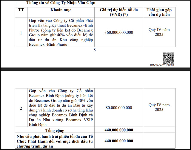 Ngoài ra, doanh nghiệp còn dự kiến sử dụng số tiền thu đượccho mục đích thực hiện chương trình, dự án đầu tư của công ty, cụ thể là góp vốnđầu tư vào các công ty liên kết để tăng vốn điều lệ nhằm thực hiện đầu tư các dưạ́n do các công ty này làm chủ đầu tư. Thông tin về các công ty nhận vốn góp gồm:Tối đa 360 tỷ đồng góp vốn vào Công ty Cổ phần Phát triển Hạ tầng Kỹ thuậtBecamex -Bình Phước (công ty liên kết do Becamex Group nắm giữ 40% vốn điều lệ)để đầu tư dự án Khu công nghiệp Becamex -Bình Phước; Tối đa 80 tỷ đồng góp vốnvào Công ty Cổ phần Becamex Bình Định (công ty liên kết do Becamex Group nắm giữ40% vốn điều lệ) để đầu tư dự án Đầu tư xây dựng và kinh doanh cơ sở hạ tầngKhu công nghiệp Becamex Bình Định và Dự án Nhà xưởng Becamex VSIP Bình Định.