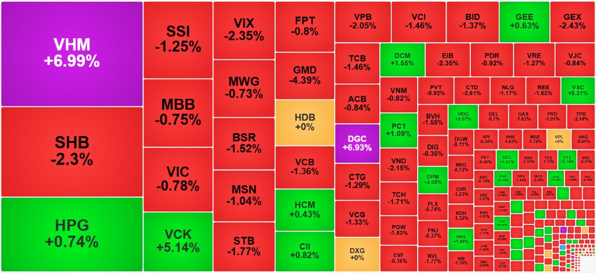Trên toàn thị trường, áp lực bán thể hiện rõ ở nhóm cổ phiếu vừa và nhỏ. Có tới 151 mã giảm trên 1%, chiếm hơn 46% tổng giá trị giao dịch sàn HoSE. Nhiều mã ghi nhận thanh khoản lớn đi kèm mức giảm sâu như VIX, BSR, GMD, VCI, GEX và VCG.