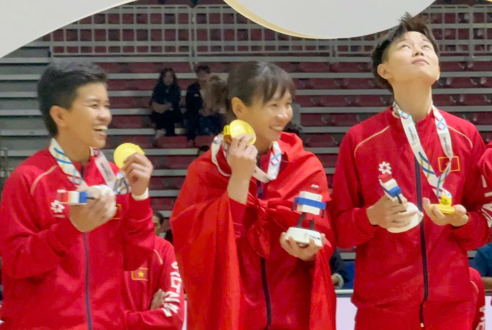 Thùy Trang (giữa) nhận huy chương vàng môn futsal nữ SEA Games 33. Ảnh: VIỆT AN