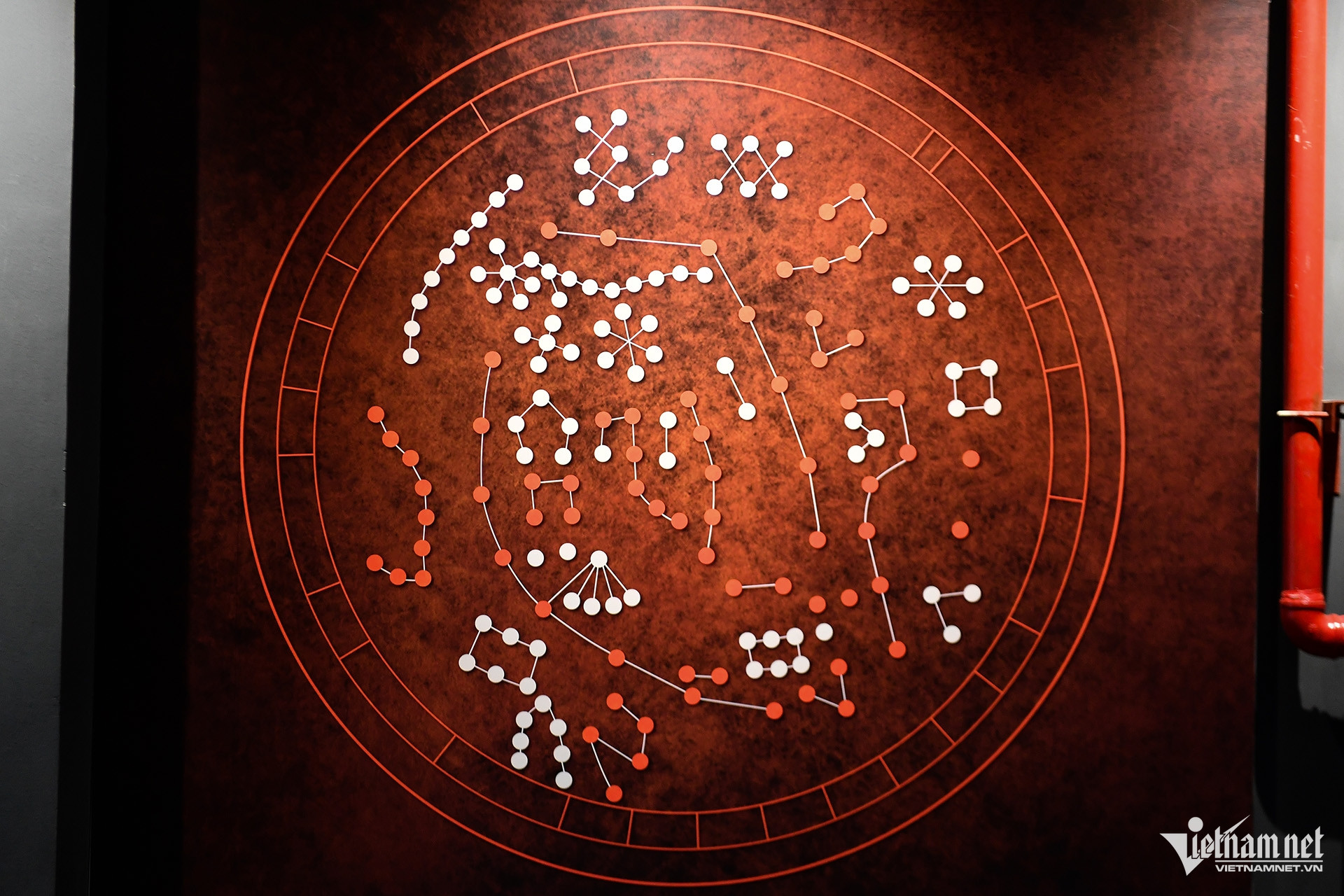 Hình ảnh ấn tượng đầu tiên ở đây là sơ đồ các chòm sao trên thiên cầu minh họa cách con người nhận diện và hệ thống hóa bầu trời đêm. Vòng tròn lớn tượng trưng cho thiên cầu - bầu trời bao quanh Trái Đất theo cách nhìn của người quan sát.