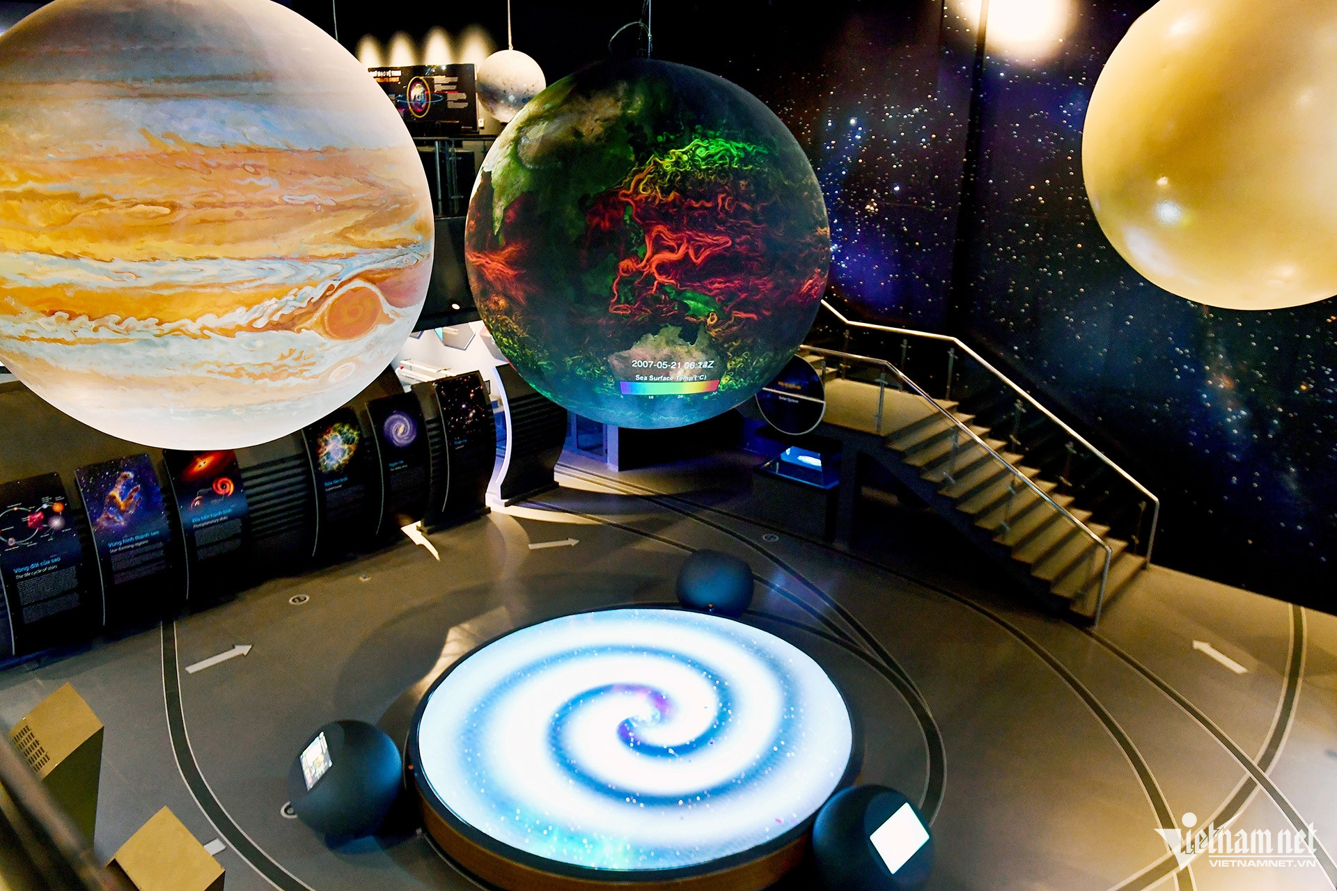 Tại đây, những quả cầu lớn treo trên cao đại diện cho Mộc Tinh (Jupiter) với hình ảnh các dải mây, Trái Đất hiển thị dữ liệu màu (nhiệt độ, dòng hải lưu, khí quyển…) và các hành tinh khác trong hệ Mặt Trời.