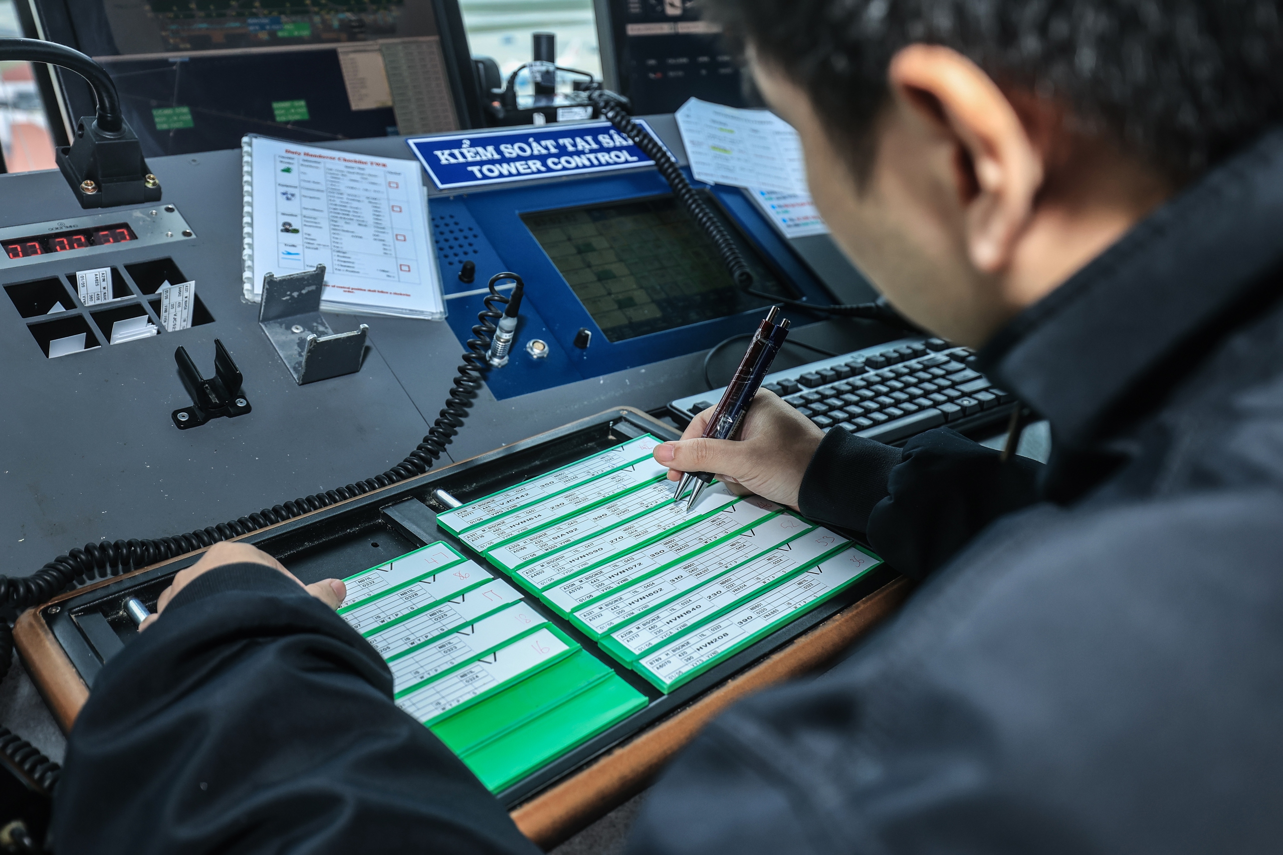 Kiểm soát viên không lưu sử dụng bút với hai màu xanh - đỏ để ghi những thông số cơ bản của chuyến bay trên băng phi diễn.