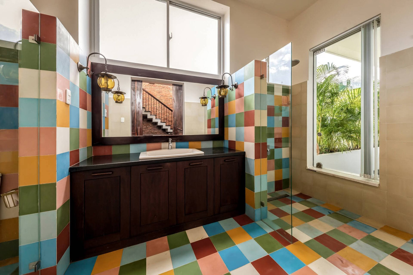 Bên cạnh những mảng tường thô mộc, nội thất gỗ trầm tĩnh, các mảng miếng màu sắc cũng được sử dụng tạo không khí đa dạng cho không gian.