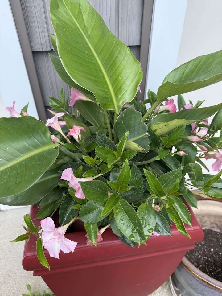 Chậu hoa hồng phấn được trồng xen với chuối cảnh. Ảnh: FB Lien Pham