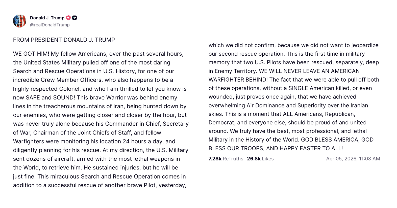 Ngày 5/4/2026, Tổng thống Mỹ Donald Trump cho biết trên nền tảng mạng xã hội Truth Social rằng trong chiến dịch giải cứu, ông đã chỉ đạo quân đội Mỹ điều hàng chục máy bay, trang bị những vũ khí sát thương mạnh nhất thế giới, để đưa phi công gặp nạn trở về. Kết quả là các lực lượng Mỹ đã giải cứu thành công và Đại tá gặp nạn đã trở về "AN TOÀN VÀ BÌNH AN!”. Ảnh chụp màn hình
