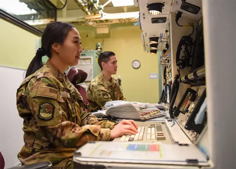 Các thành viên kíp chiến đấu trong mô hình huấn luyện quy trình phóng tên lửa. Ảnh: Không quân Mỹ