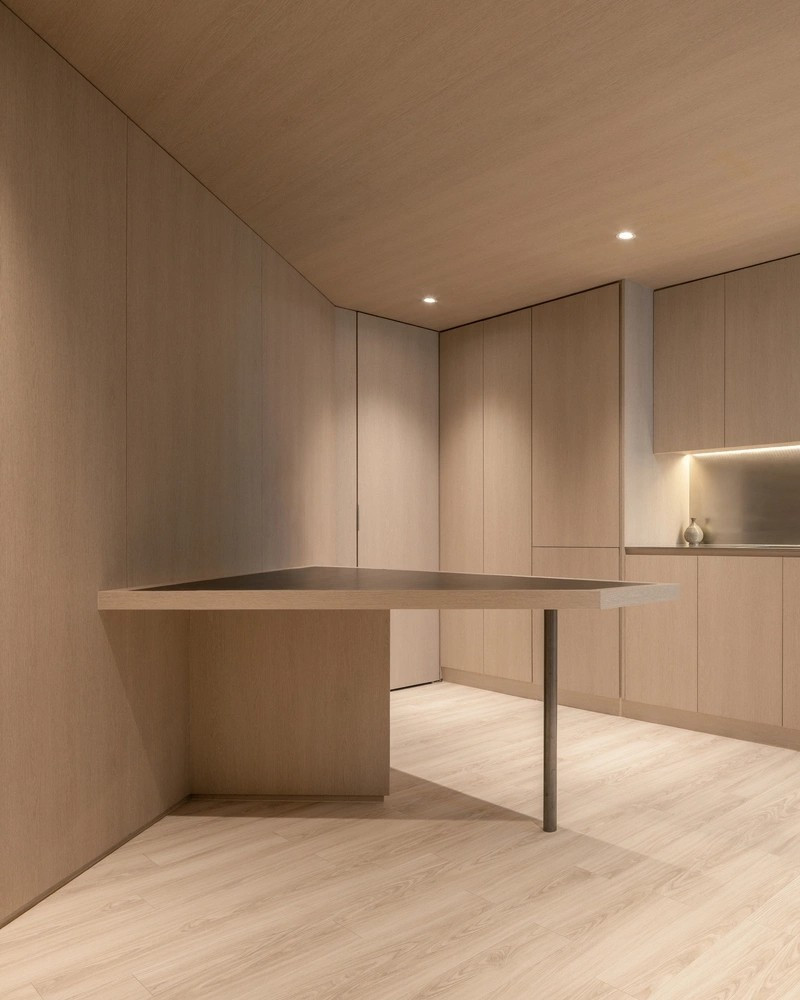 Bàn ăn tích hợp với hệ tủ bếp, thiết kế hình học tối giản. Ảnh: Joel Moritz