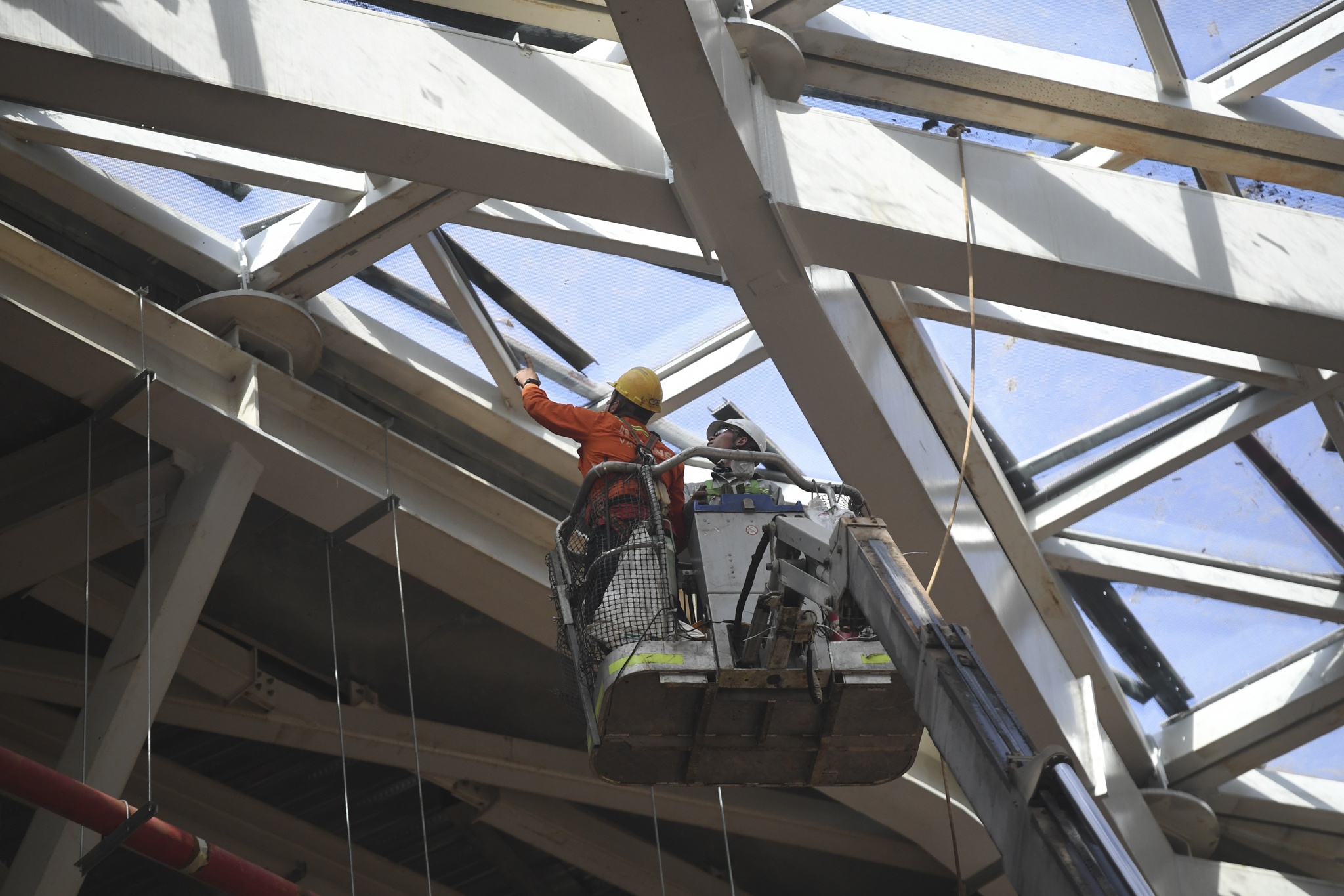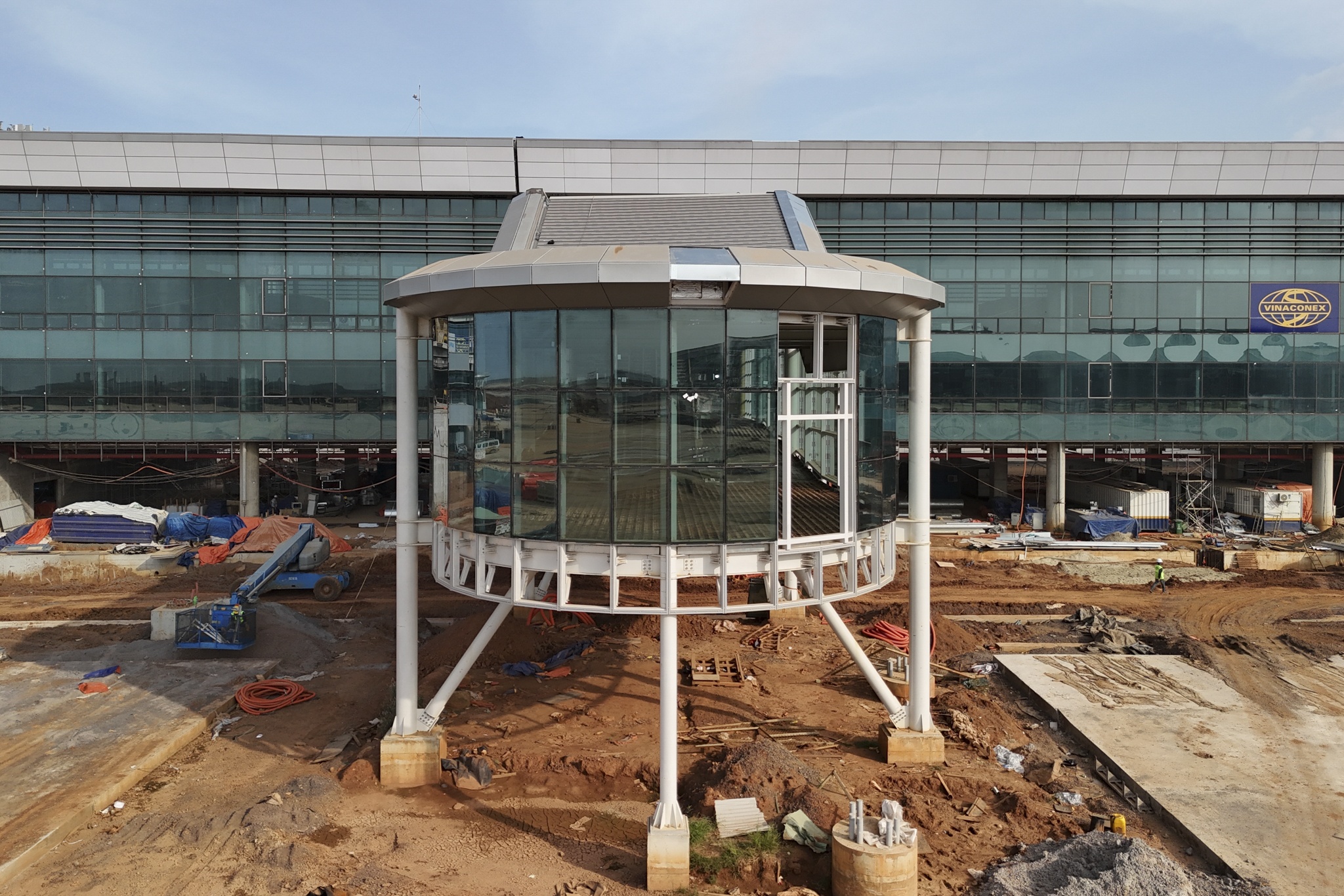 Hạng mục cầu ống lồng cố định kết nối nhà ga hành khách và sân đỗ máy bay đã hoàn thành cơ bản phần khung thép, đang được hoàn thiện lắp kính.