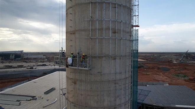 Tháp không lưu, một trong những công trình quan trọng nhất của sân bay đang dần hoàn thiện trước khi chuyến bay đầu tiên hạ cánh xuống sân bay này.