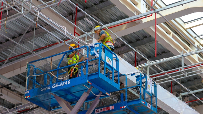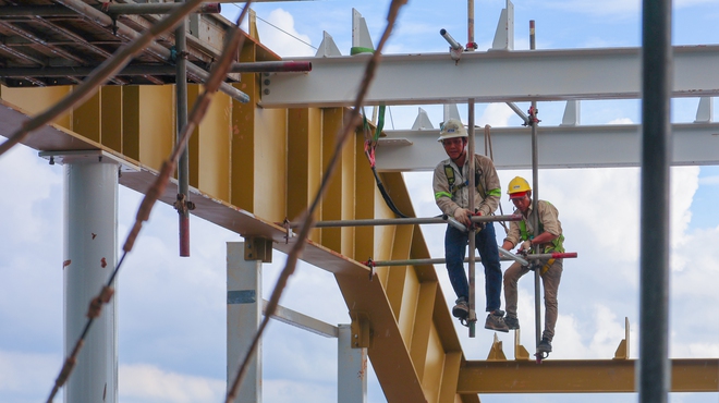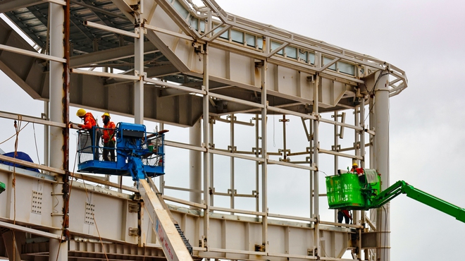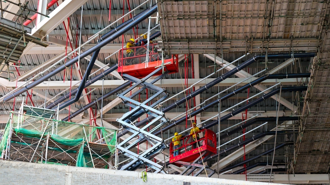 Phần khung nhôm dưới mái đang được lắp đặt, tốc lực thi công để hoàn thành và vượt tiến độ một số mục tiêu đề ra.