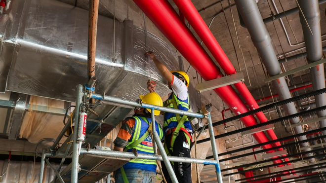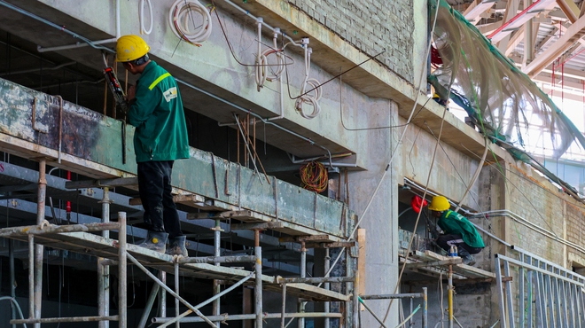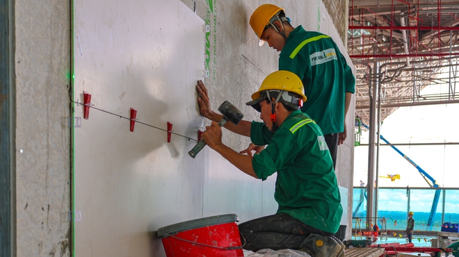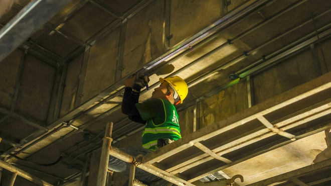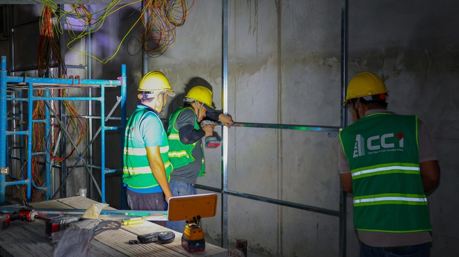 Công nhân thi công đường dây điện, hoàn thiện các khung nhôm gia cố công trình bề mặt. Những chi tiết bên trong quá trình xây dựng được đo, tính toán một cách chuẩn xác nhất.