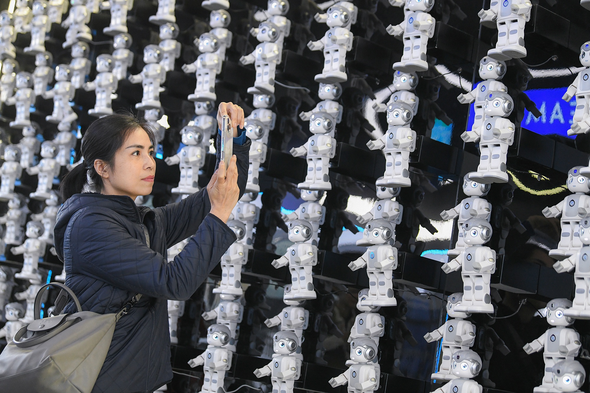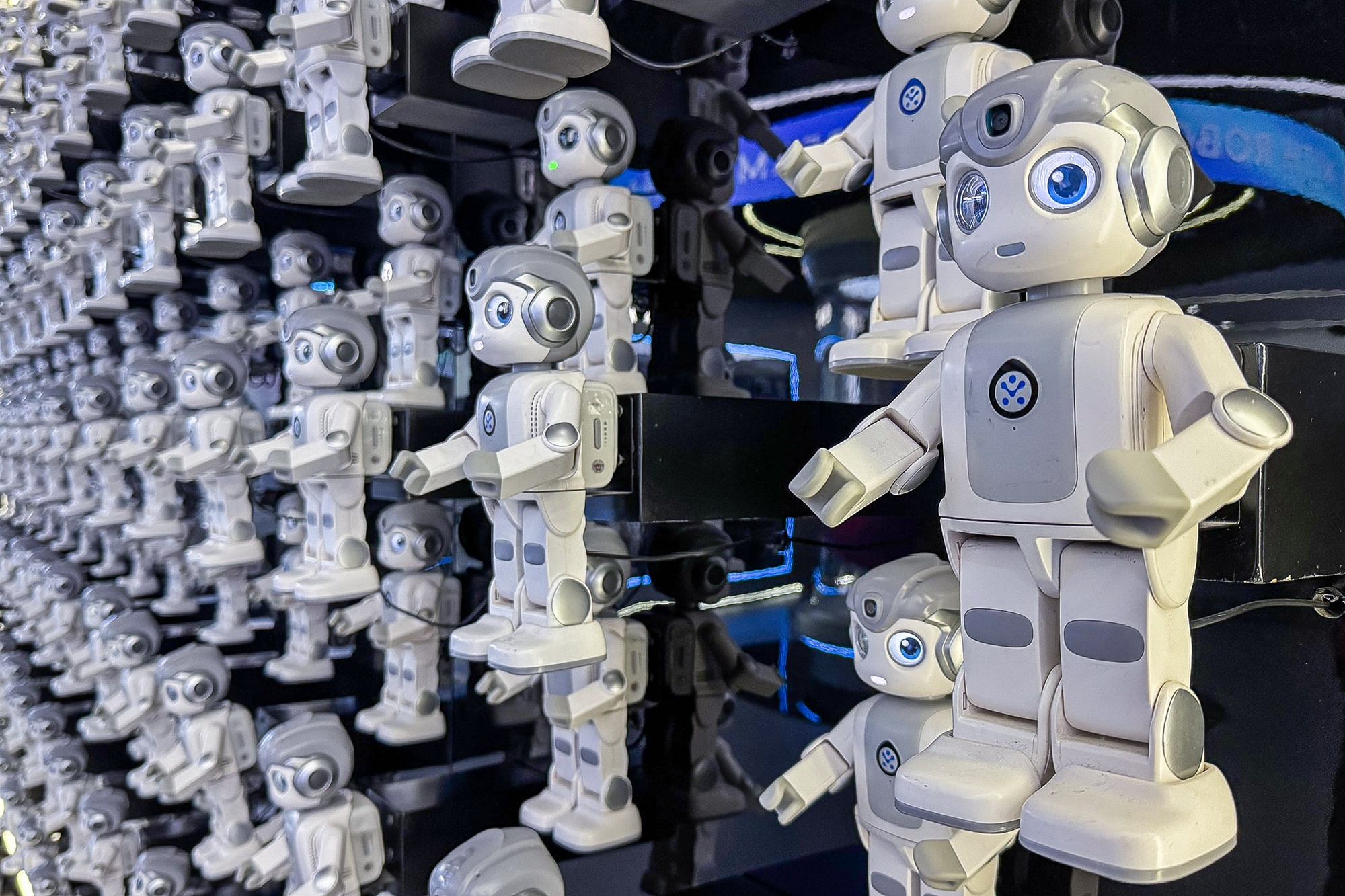 Khu vực triển lãm nổi bật với bức tường gồm 233 robot Alpha Mini tạo thành đội hình đẹp mắt với khả năng vũ đạo linh hoạt cùng ngoài hình dễ thương gây thiện cảm với du khách tham quan.