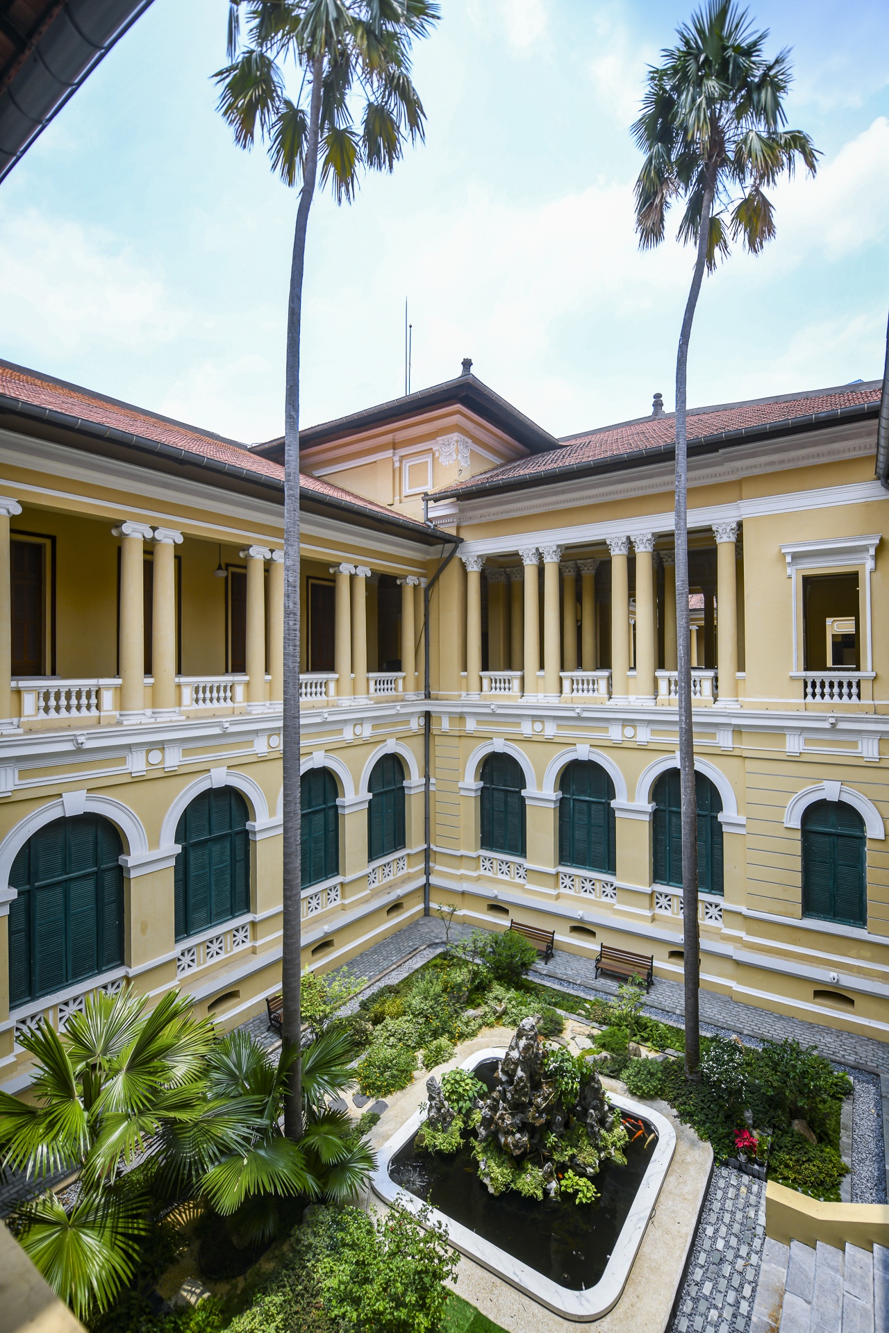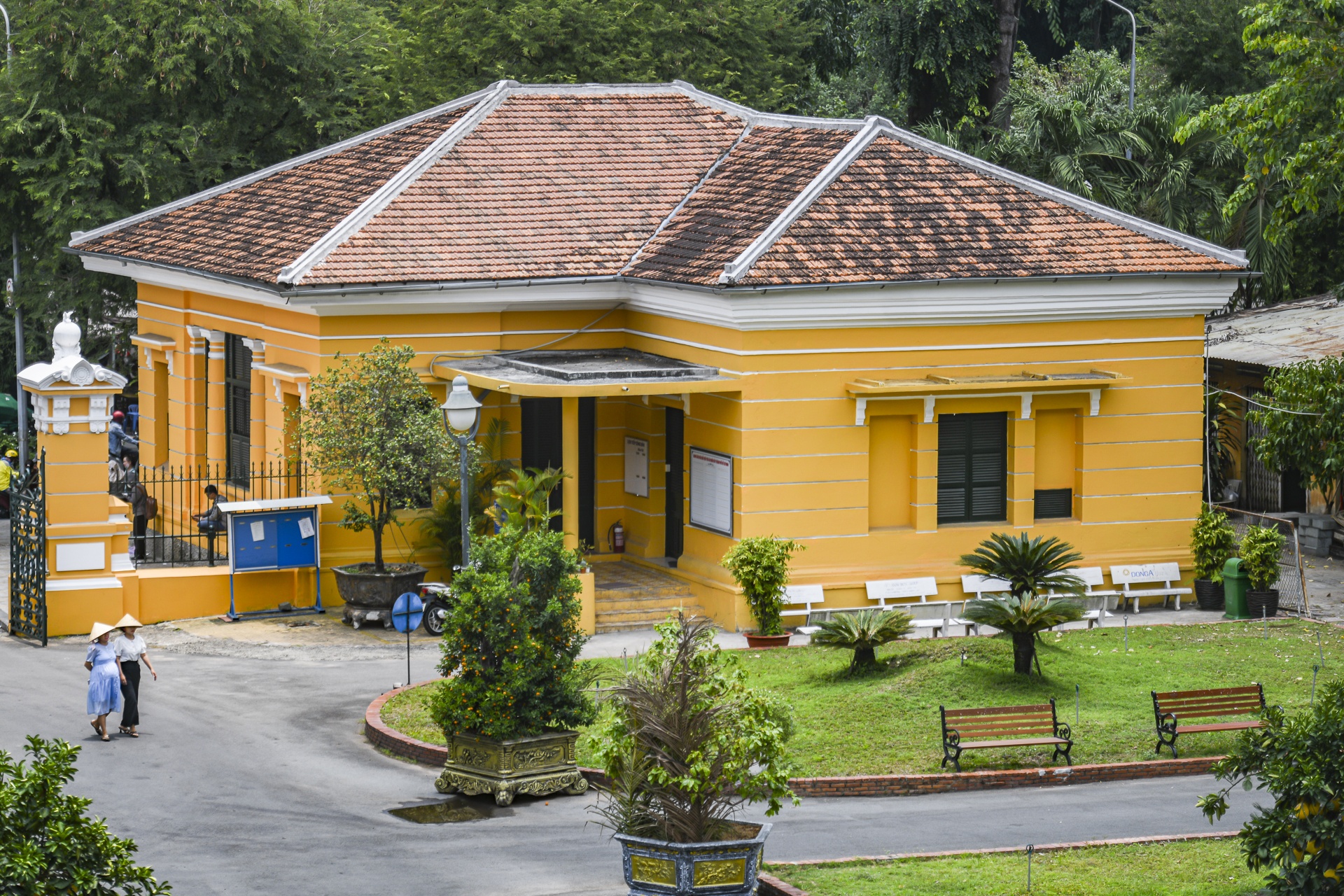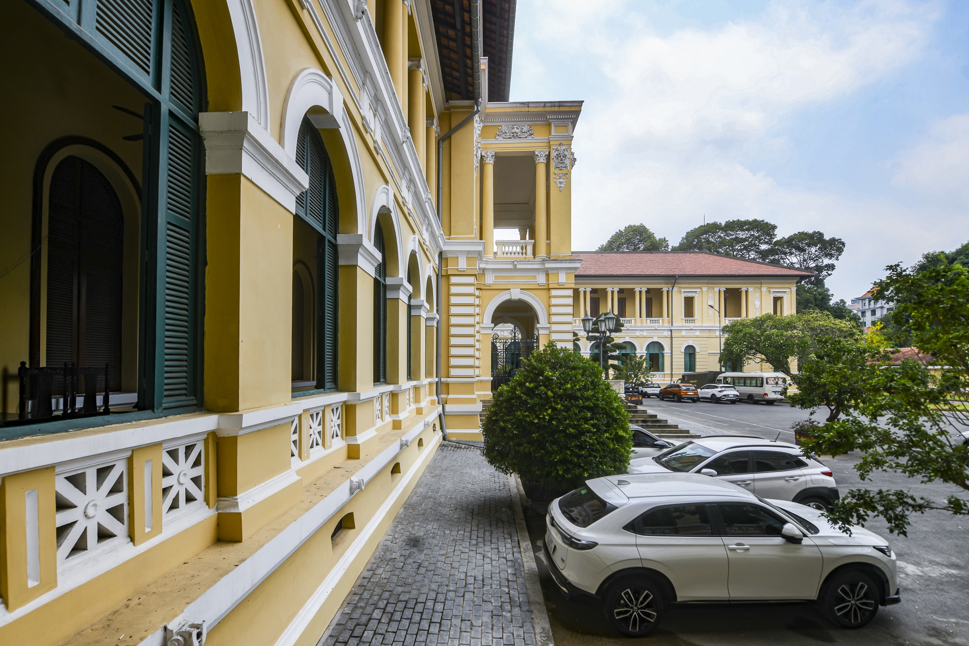Trong quá trình trùng tu, những hạng mục xây dựng tạm bợ sau này như nhà tiền chế, nhà xe, căn tin cũ đã dỡ bỏ để trả lại không gian chữ H ban đầu. Bên trái cổng chính là văn phòng tiếp công dân, tường được sơn mới. Khoảng sân trước sảnh chính rộng lớn, nhiều mảng xanh.