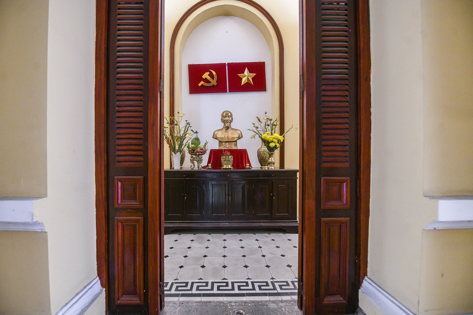 Toàn bộ lớp sơn cũ của nhiều năm đã được cạo bỏ để phủ mới, màu sơn được nghiên cứu dựa trên các lớp mẫu cũ để tái hiện tone vàng đặc trưng của kiến trúc Pháp. Tượng thờ Chủ tịch Hồ Chí Minh được đặt trang nghiêm trong phòng riêng, trên tường là cờ Việt Nam và cờ Đảng.