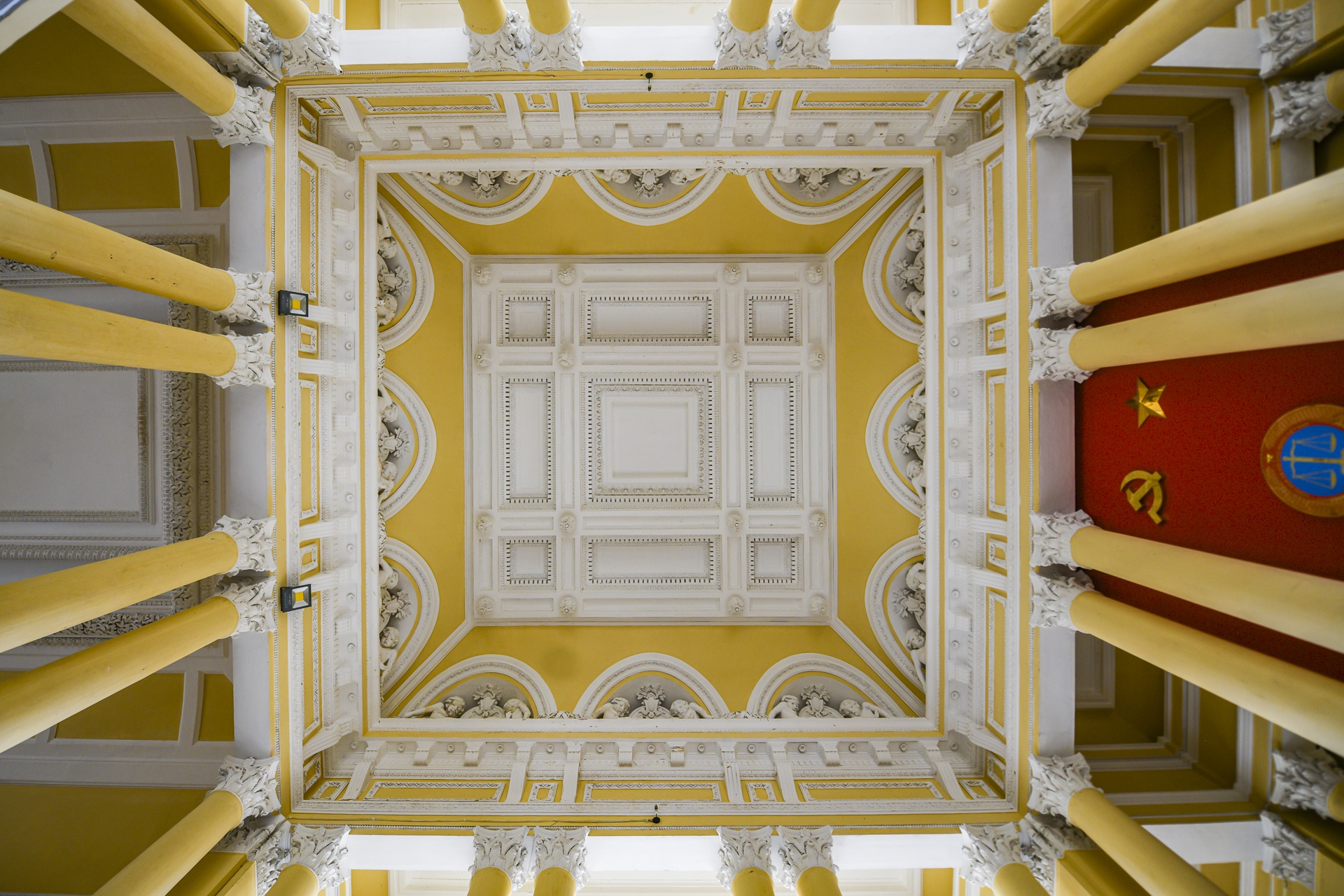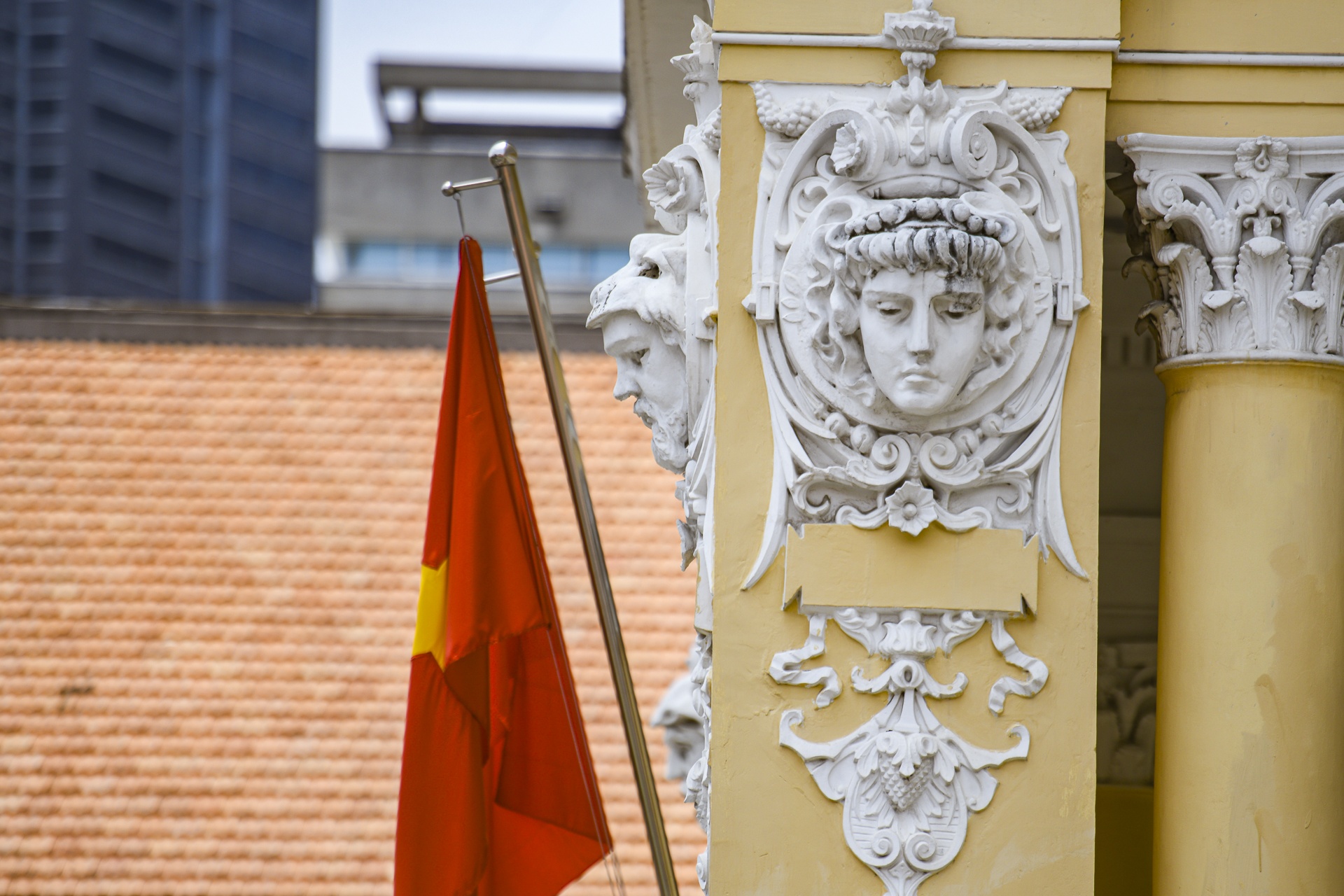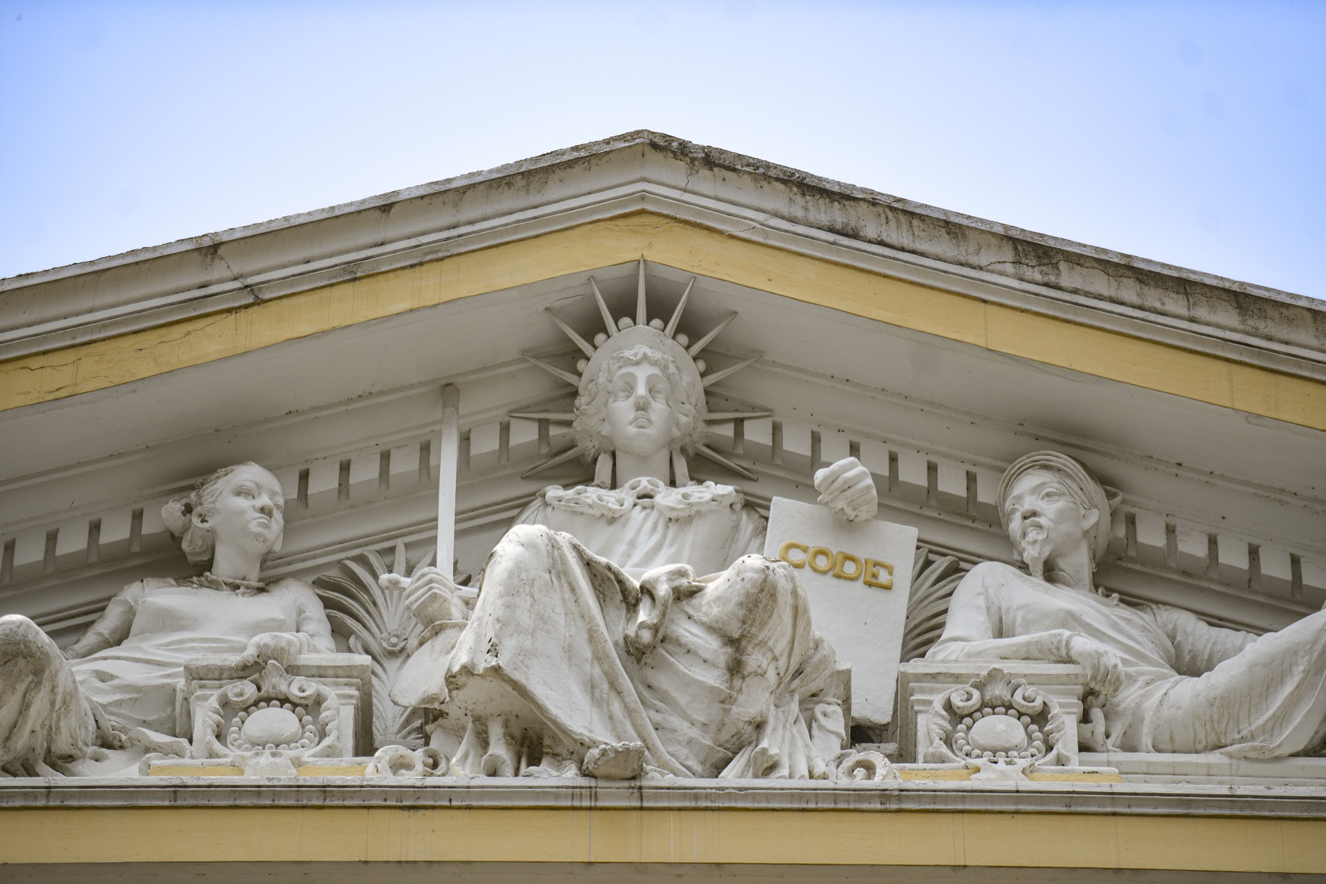 Mỗi phù điêu trong tòa nhà đều mang ý nghĩa riêng biệt, thể hiện nét kiến trúc Hy Lạp cổ đại - có sự liên quan mật thiết đến kiến trúc La Mã - pha lẫn kiến trúc Phục Hưng. Lối vào sảnh, dòng chữ "pháp đình" được sơn sửa rõ nét hơn.