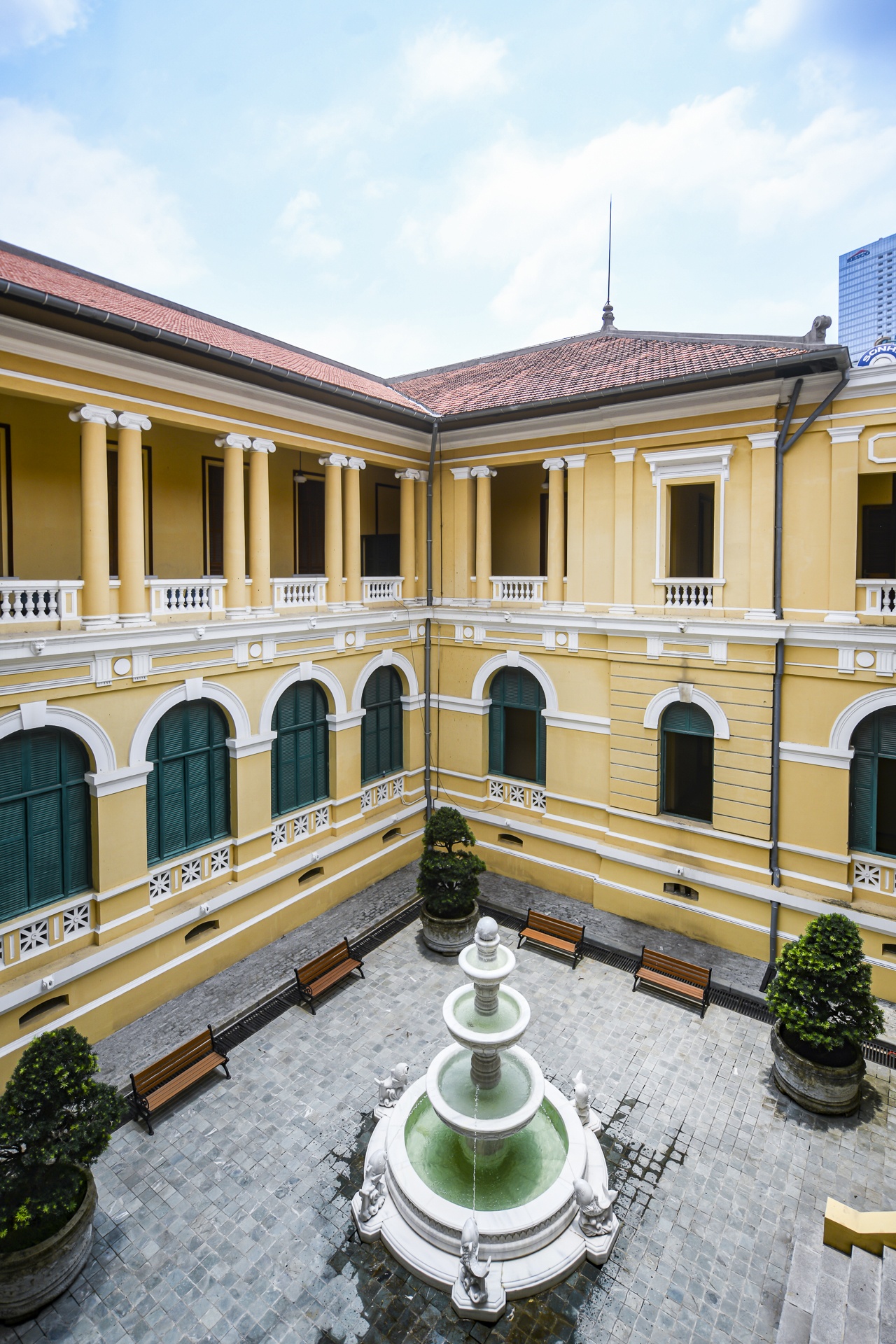 Tòa nhà gồm khối Pháp hình chữ U và khối Mỹ xây dựng sau thành hình chữ H với tầng hầm, tầng 1 và 2, mỗi tầng cao khoảng 5,2 m. Việc trùng tu giữ nguyên kiến trúc kết hợp châu Âu và bản địa. Tiêu biểu là tượng thần Công lý (Justitia) ở giữa sảnh chính, tay phải cầm kiếm, tay trái đặt lên cuốn sách luật gắn với hệ thống pháp luật của Pháp. Đối xứng là 2 bức tượng nam và nữ cầm nón lá, quai thao truyền thống Việt Nam, thể hiện sự bình đẳng.