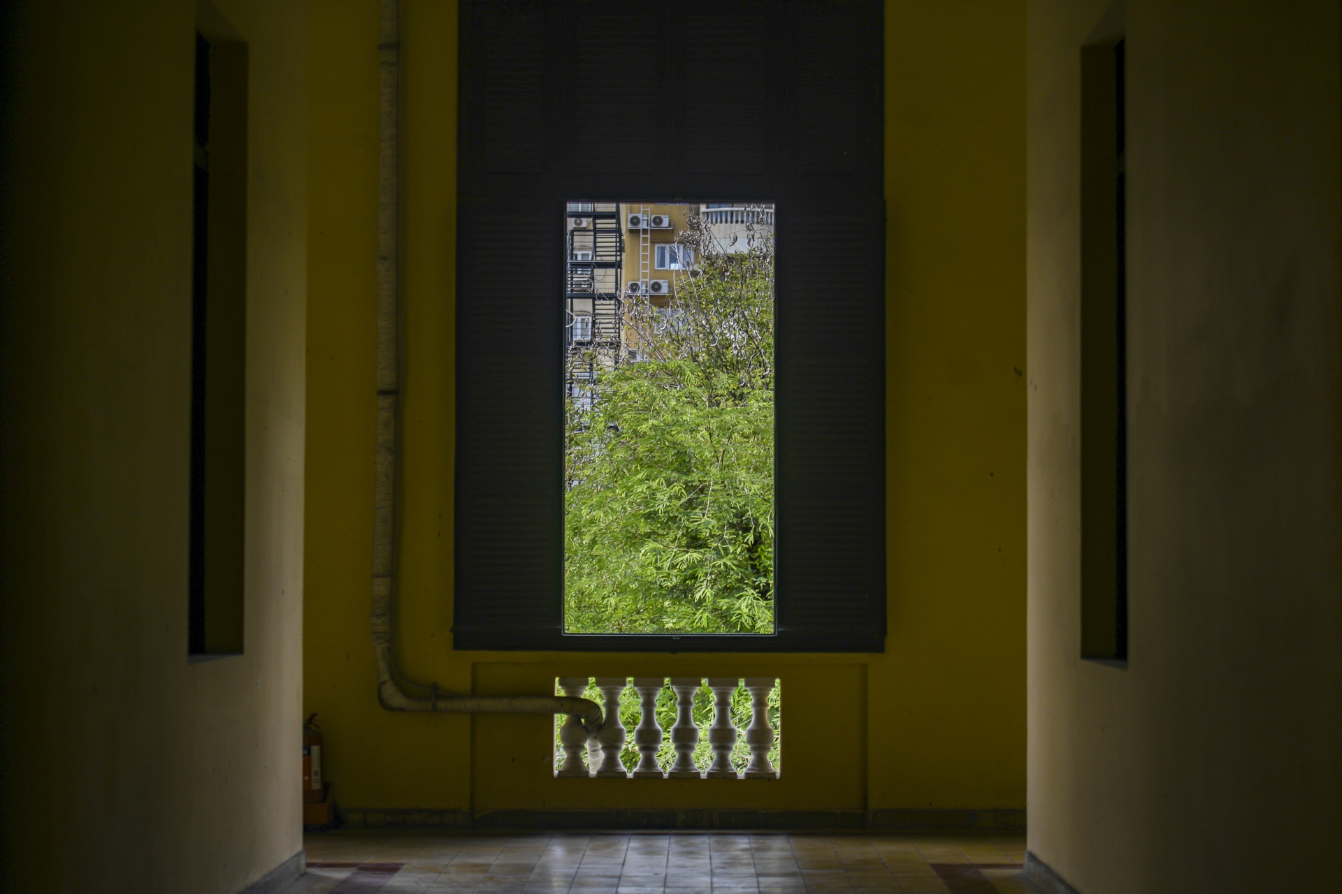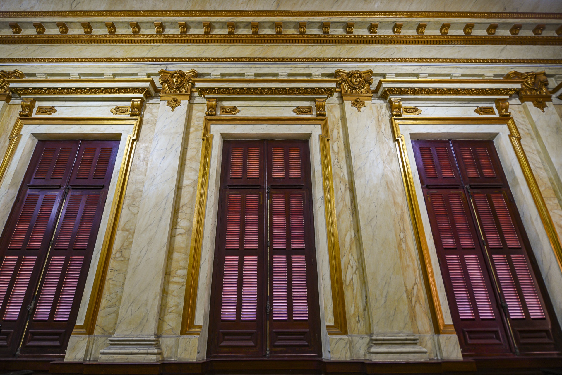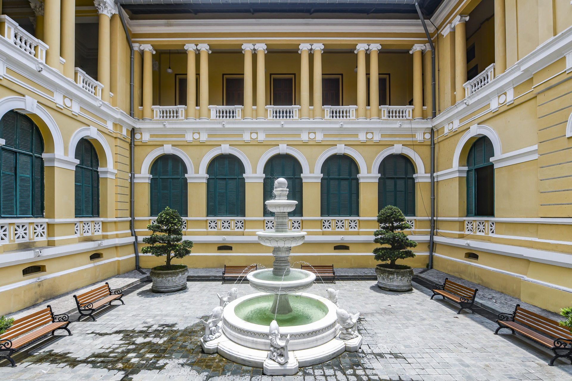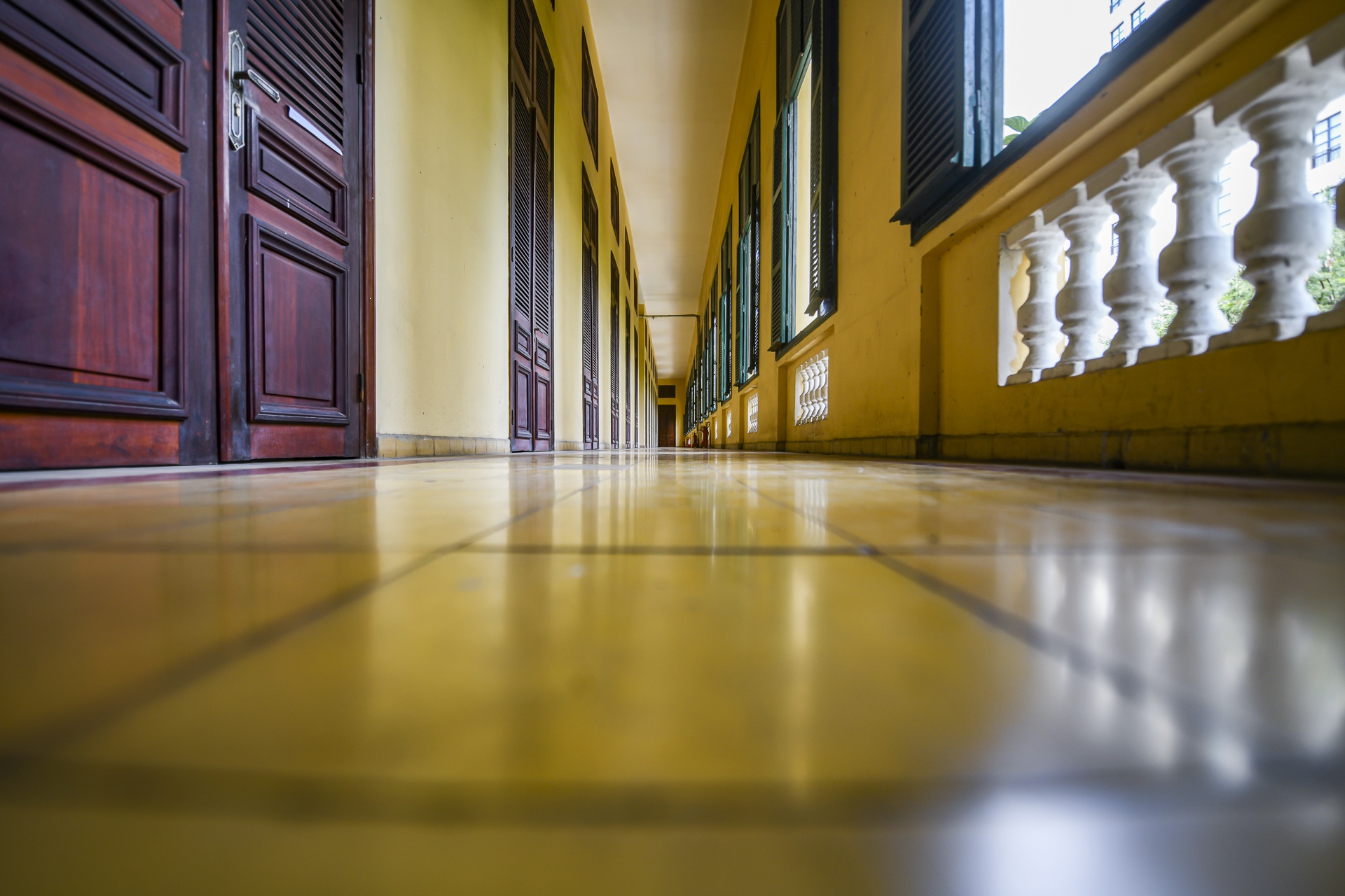 Quanh hành lang là những ô cửa vòm bố cục cân đối, dạng lá sách, sơn lại màu xanh đậm. Trước đó, khu vực này xuống cấp nghiêm trọng với nhiều mảng sơn bong tróc, xuất hiện tình trạng rêu mốc do thấm nước.