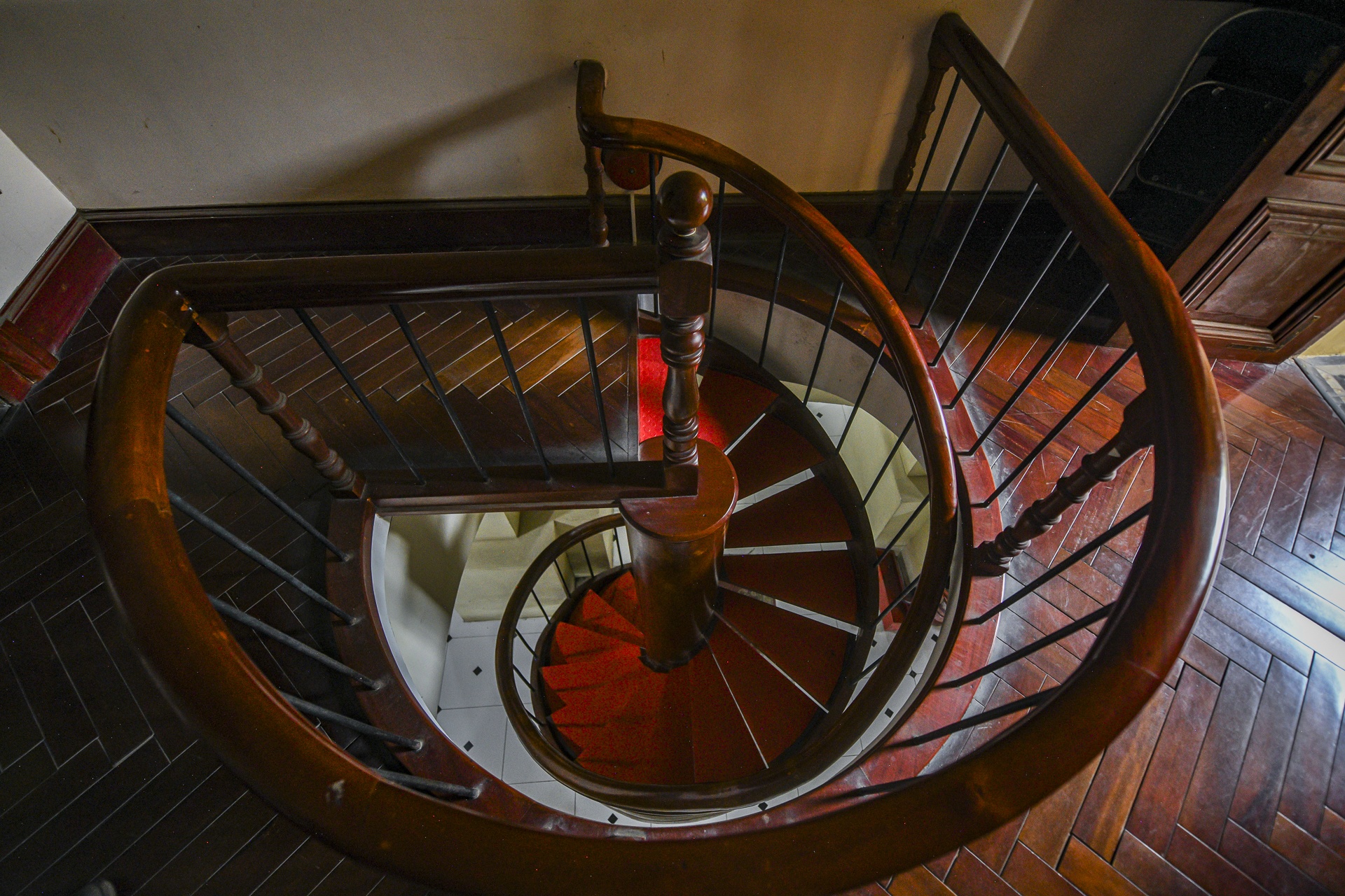 Cầu thang dẫn từ dưới lên kết hợp giữa kiến thúc La Mã và phong thủy hướng của người Việt Nam. Sau khi trùng tu, lan can và các con tiện được sơn lại màu trắng, vàng. Hai nhánh cầu thang dành cho cán bộ và biện lý, bục dừng lại là bục sinh. Riêng nhánh giữa của phạm nhân là bục tử.