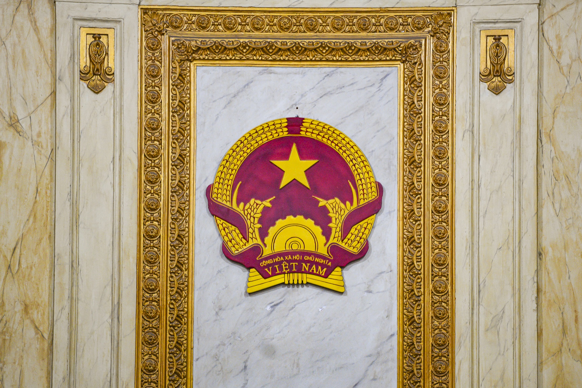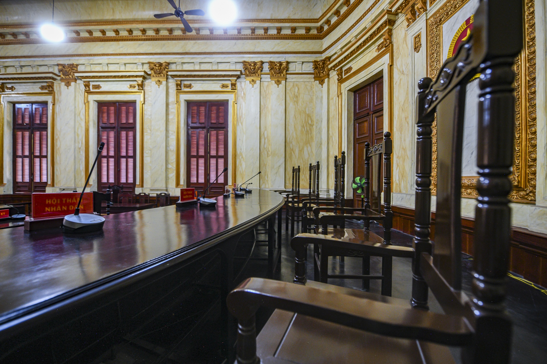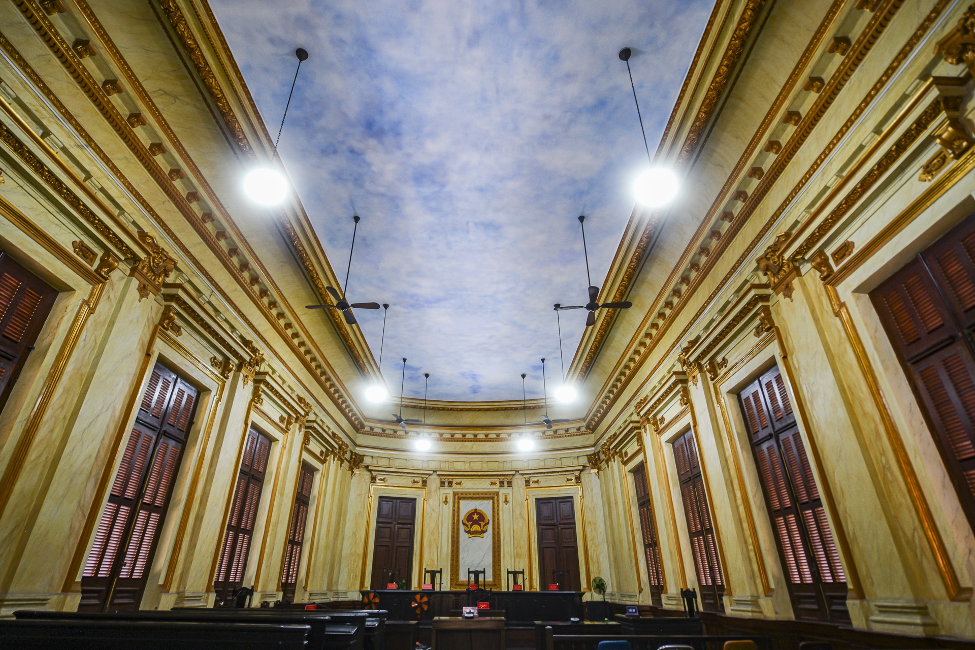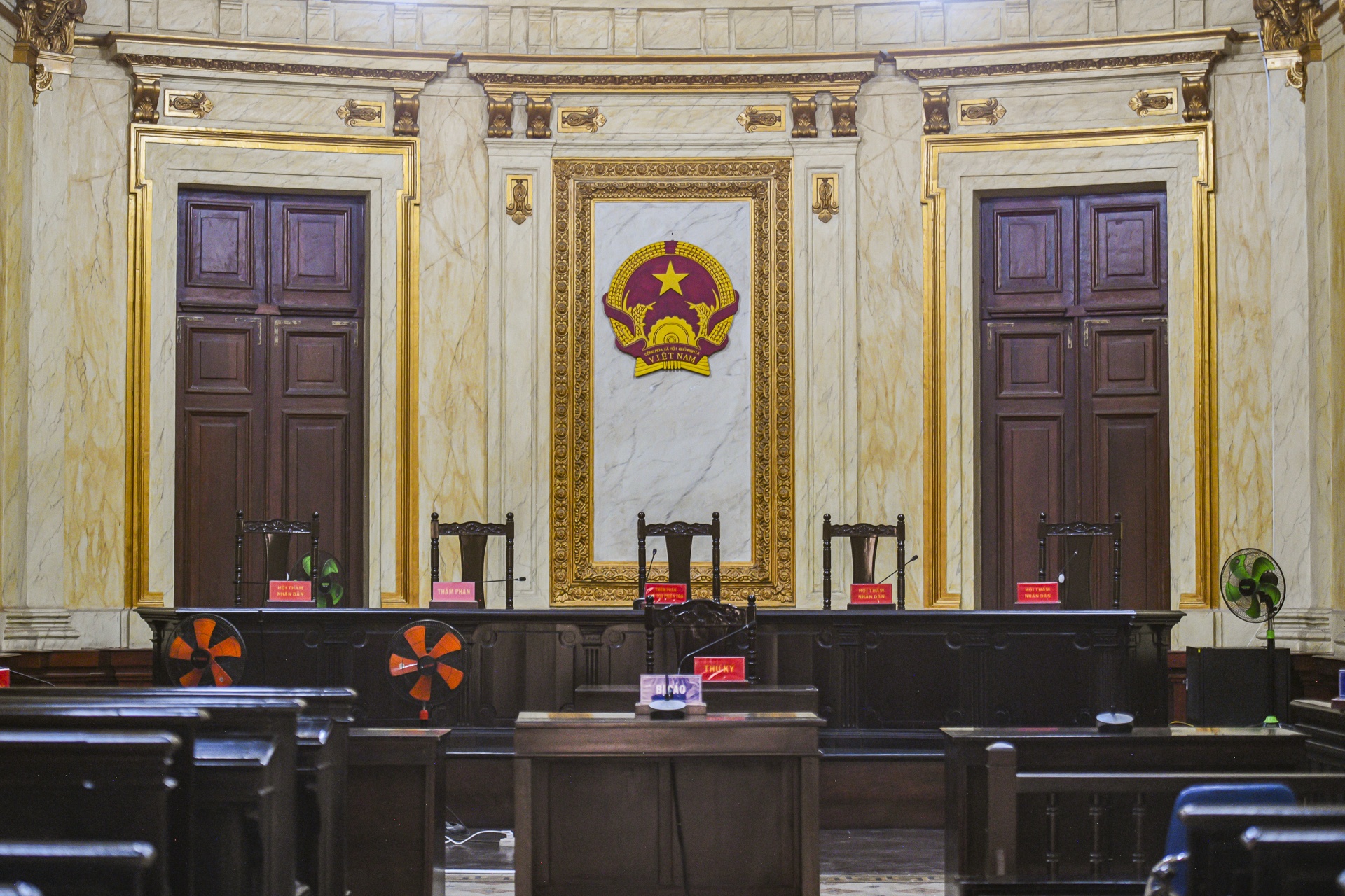 Quốc huy Việt Nam được treo trang trọng giữa phòng xử, phía trên chủ tọa, thể hiện quyền lực nhà nước và tính pháp lý của không gian.