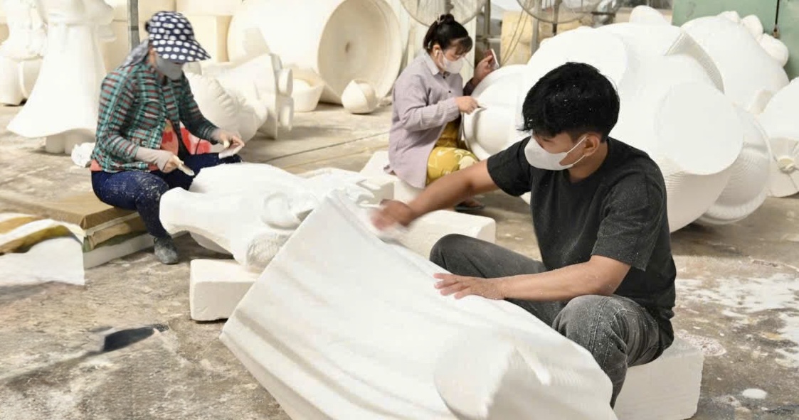 Các nghệ nhân tỉ mỉ chế tác ở mọi khâu từ bo góc tấm xốp tạo hình đến sơn màu, vẽ chi tiết...