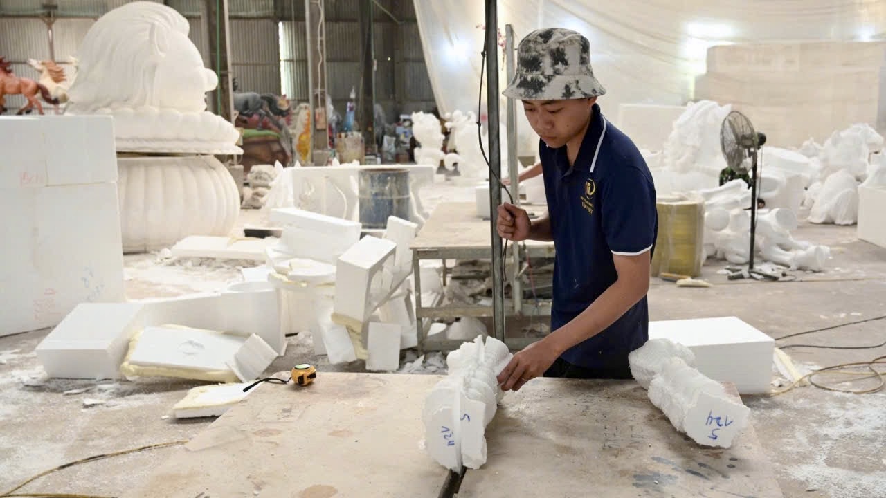 Tại xưởng chế tác linh vật ở phường Hố Nai, tỉnh Đồng Nai, không gian rộng hơn 2.500m² gần như không lúc nào ngơi nghỉ.