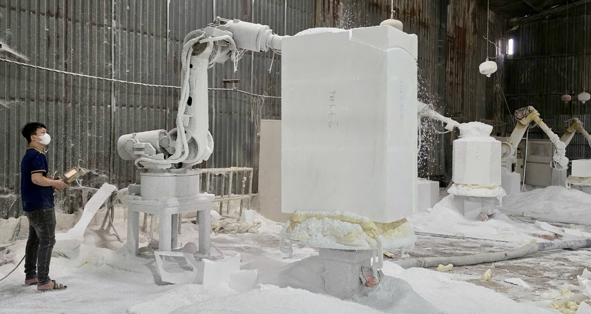 Robot giúp tạo phôi nhanh, đồng đều và đúng tỷ lệ thiết kế, rút ngắn thời gian sản xuất ở những khối hình lớn. Tuy vậy, máy móc chỉ dừng lại ở phần "xác". Để linh vật có thần thái, người thợ vẫn là yếu tố quyết định.
