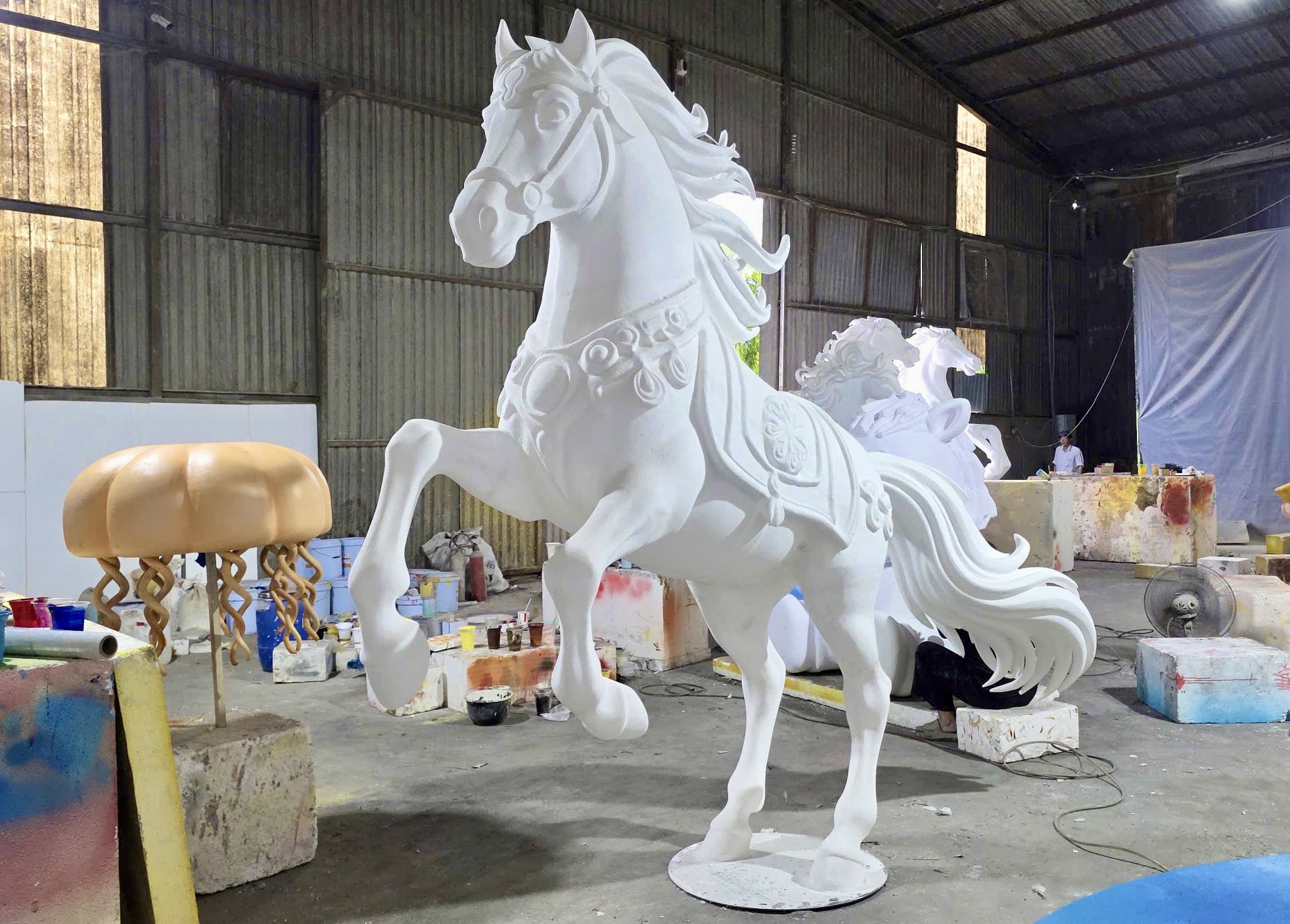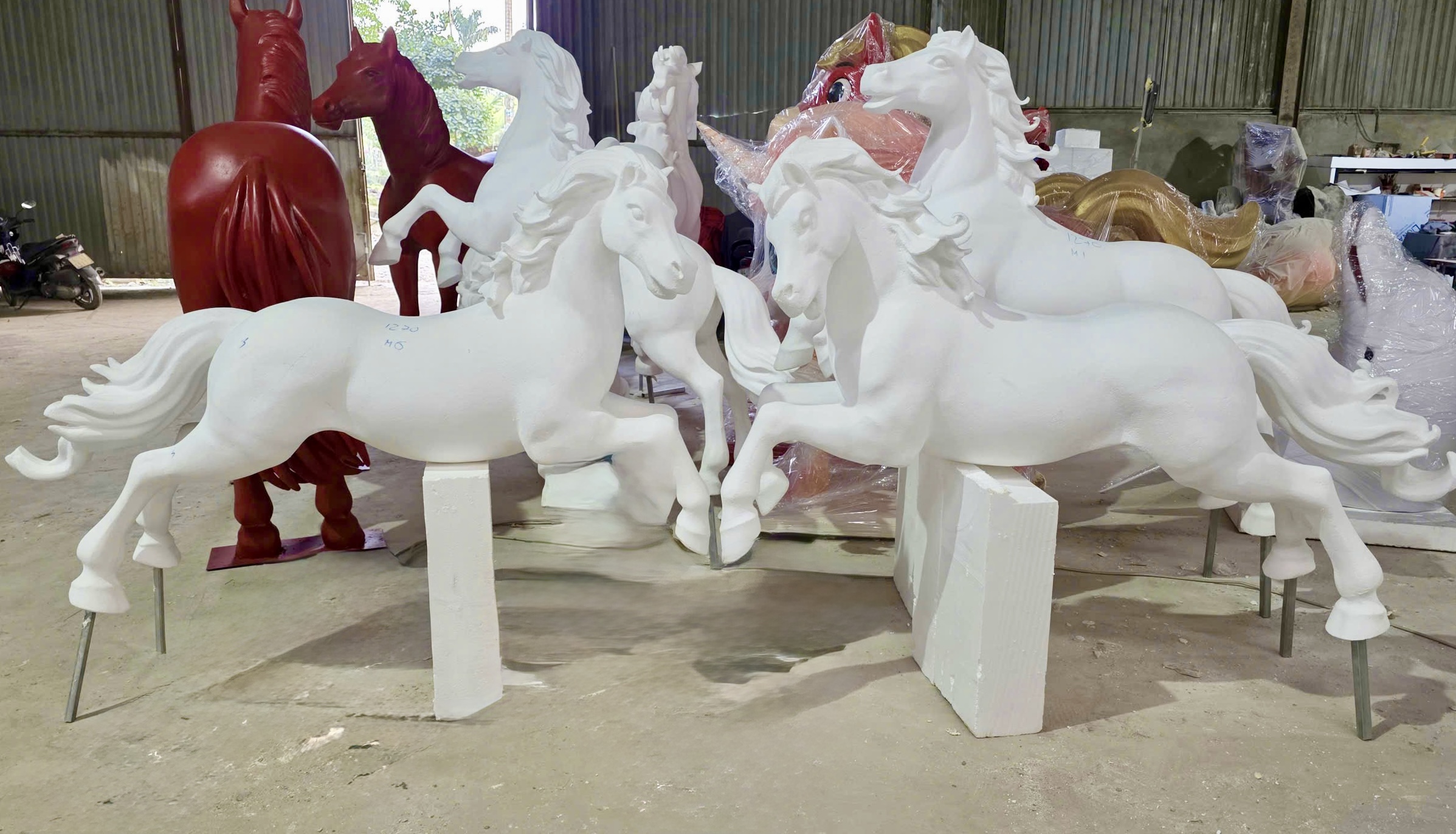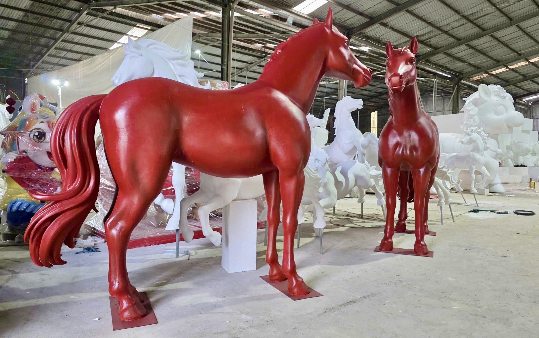 Nổi bật trong xưởng là cặp ngựa cao khoảng 5m, tổng trị giá 200 triệu đồng. Sau 10 ngày tạo hình, hai linh vật đã hoàn thiện phần khung dáng, đang chờ sơn màu để bàn giao cho khách tại TP.HCM trong tuần tới.