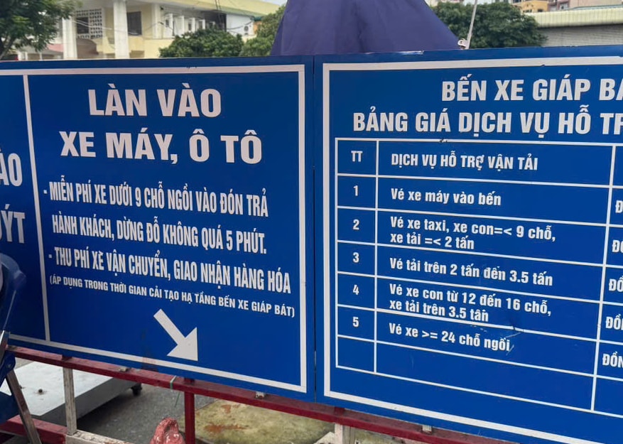 Bến xe Giáp Bát thông báo miễn phí phương tiện vào bến đón trả khách. Ảnh: Tuấn Lương