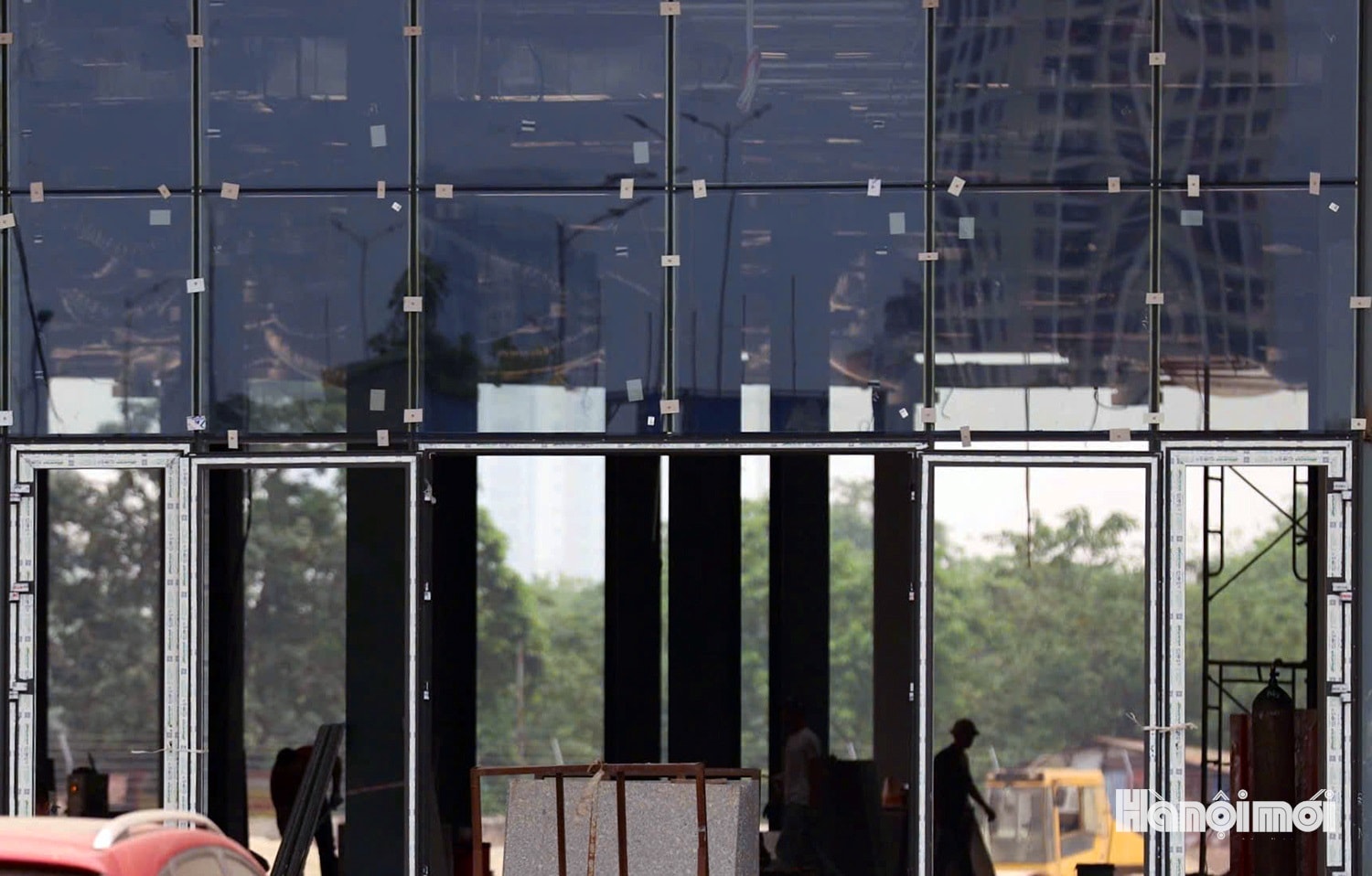 Phần cửa kính ở khu vực tầng 1 đang được hoàn thiện.