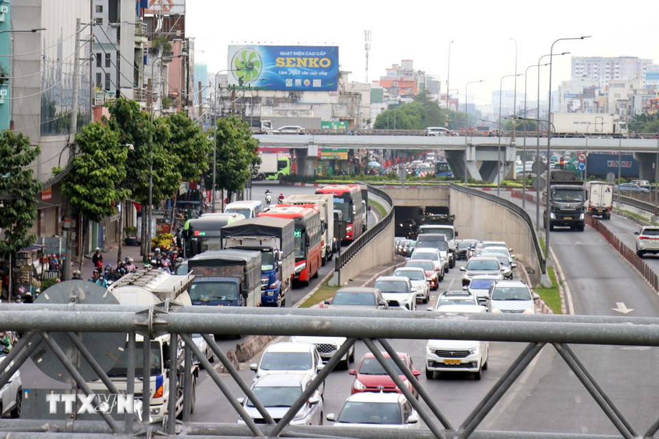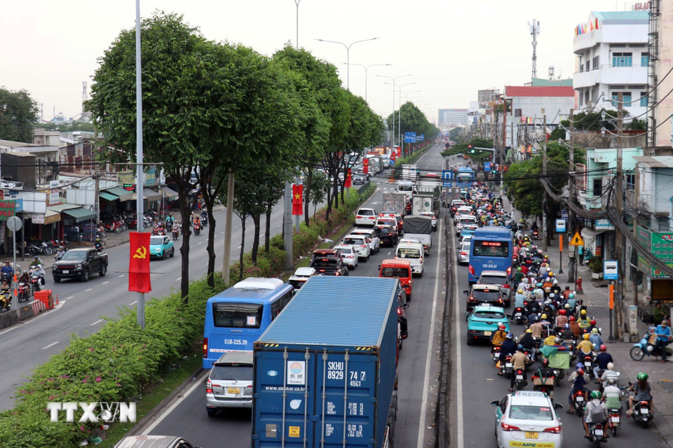 Xe ôtô xếp hàng dài di chuyển trên Quốc lộ 22, đoạn qua nút giao và bến xe An Sương. (Ảnh: Tiến Lực/TTXVN)