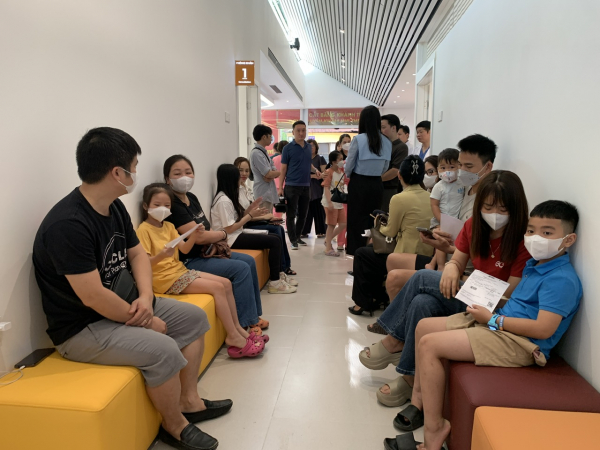 Trẻ chờ khám đeo khẩu trang để ngăn ngừa bệnh lây truyền qua đường hô hấp, trong đó có cúm mùa.